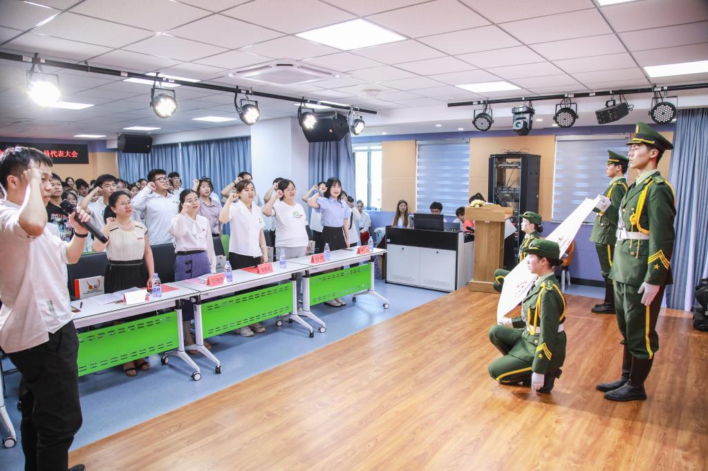 護(hù)理學(xué)院學(xué)生分會秘書長林飛準(zhǔn)帶領(lǐng)全體會員宣誓。鏗鏘有力的宣誓詞響徹整個大廳,更堅定了與會會員的“人道、博愛、奉獻(xiàn)”的紅十字精神。