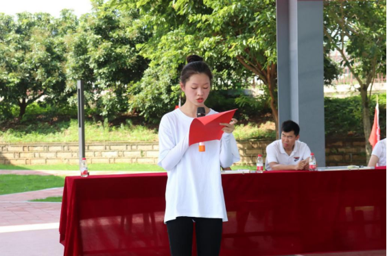 賽前召開(kāi)了簡(jiǎn)短但不失隆重的開(kāi)幕儀式,全場(chǎng)師生奏唱國(guó)歌,裁判員代表宣誓,學(xué)生代表張舒婷現(xiàn)場(chǎng)宣講長(zhǎng)征精神。
