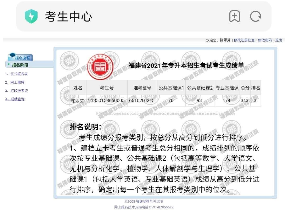 18影像303班陳翠芬同學(xué)的“專升本”考試成績(jī)位居檢驗(yàn)專業(yè)考生第三。
