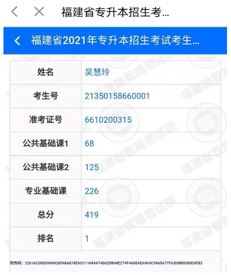 18醫(yī)學(xué)檢驗(yàn)技術(shù)303班吳慧玲同學(xué)的“專升本”考試成績(jī)?cè)谌〗n立卡戶考生中排名第一。