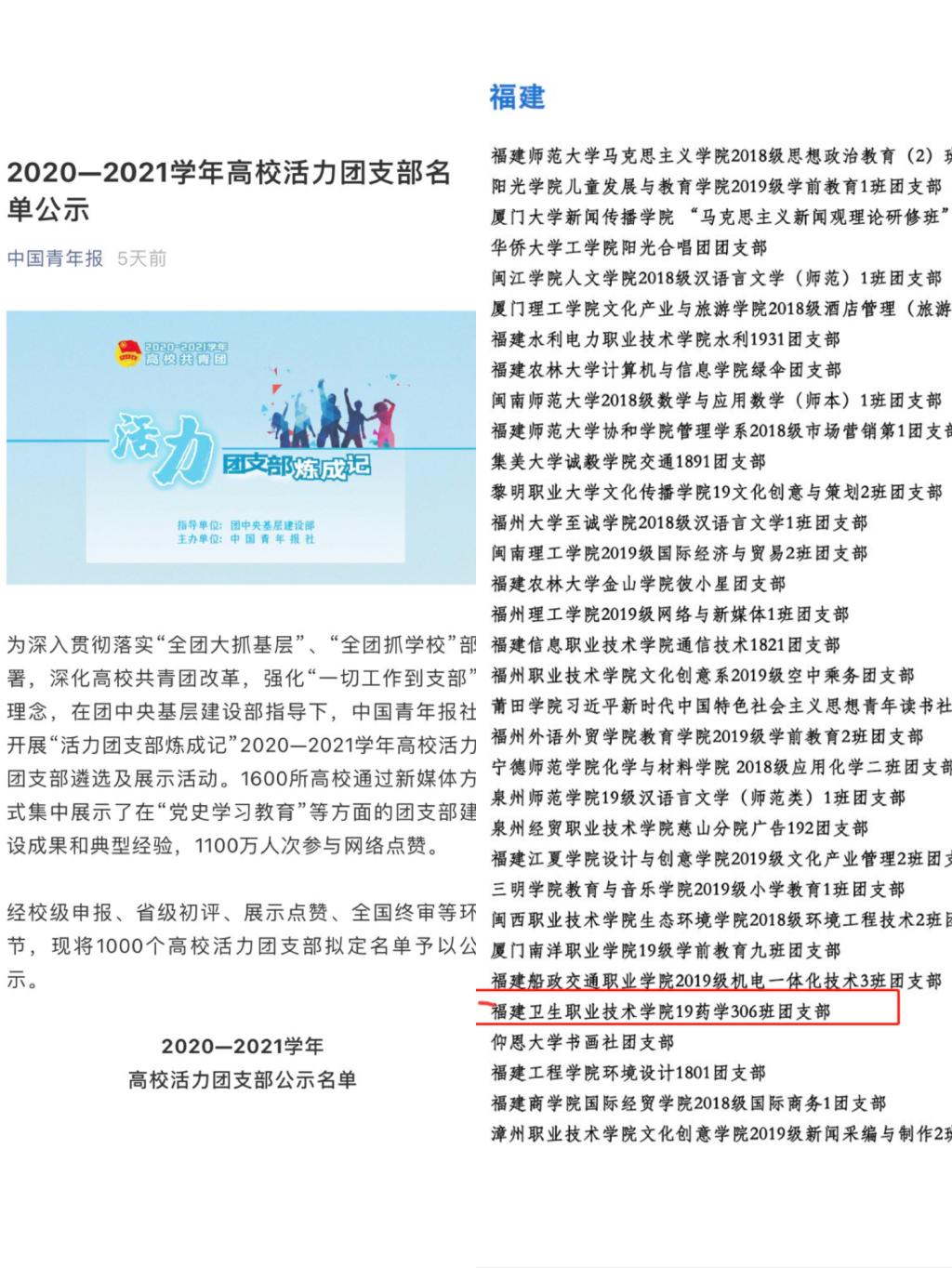 為深入貫徹落實(shí)“全團(tuán)大抓基層”、“全團(tuán)抓學(xué)?!辈渴?,深化高校共青團(tuán)改革,強(qiáng)化“一切工作到支部”理念,在團(tuán)中央基層建設(shè)部的指導(dǎo)下,中國(guó)青年報(bào)社開展全國(guó)高校活力團(tuán)支部遴選及展示活動(dòng)。經(jīng)過新媒體展示評(píng)選,我校藥學(xué)院19藥學(xué)306班團(tuán)支部榮獲2020-2021學(xué)年高校活力團(tuán)支部。
