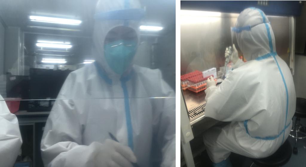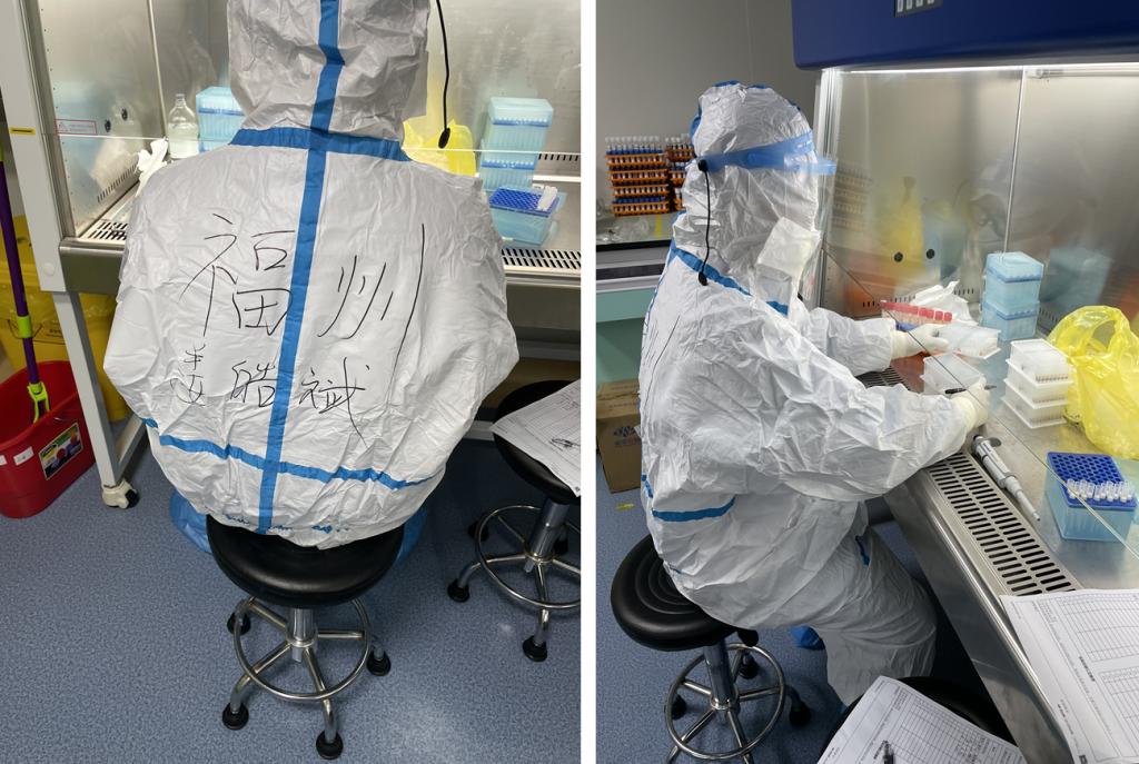 姜皓斌,我校2018級(jí)檢驗(yàn)302班的畢業(yè)生,就職于福州迪安醫(yī)學(xué)檢驗(yàn)實(shí)驗(yàn)室有限公司,支援廣州增城區(qū)。他不懼高溫奮戰(zhàn)一線,為廣州核酸篩查贏得了寶貴的時(shí)間,對(duì)他而言,每一次進(jìn)入實(shí)驗(yàn)室工作都是一次考驗(yàn),既要精準(zhǔn)地完成檢測(cè),又要忍受身體和心理上的煎熬。厚實(shí)的防護(hù)服密不透風(fēng),呼吸面罩容易起霧,進(jìn)入標(biāo)本制備區(qū)后不能隨意進(jìn)出,必須在“全副武裝”下堅(jiān)持五六個(gè)小時(shí),直到完成整個(gè)實(shí)驗(yàn)過程。每次走出實(shí)驗(yàn)室,他都是全身濕透,滿臉布滿壓痕。