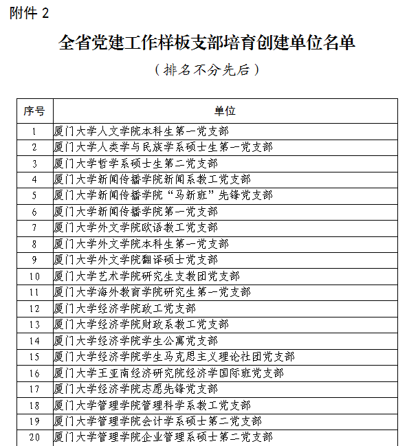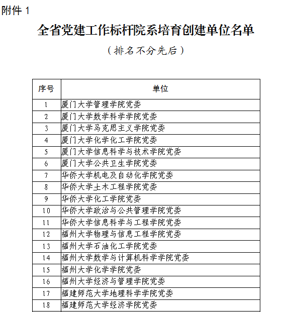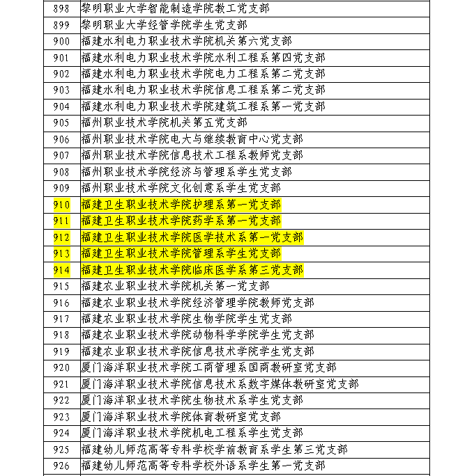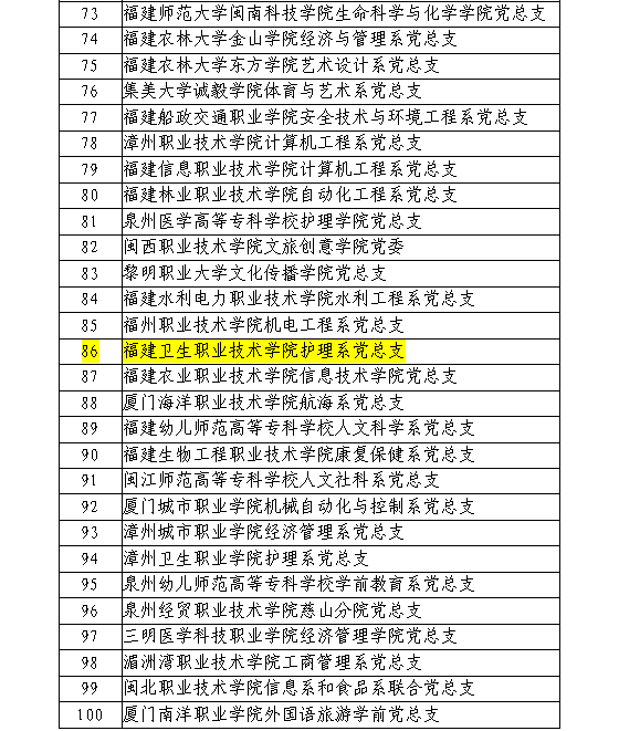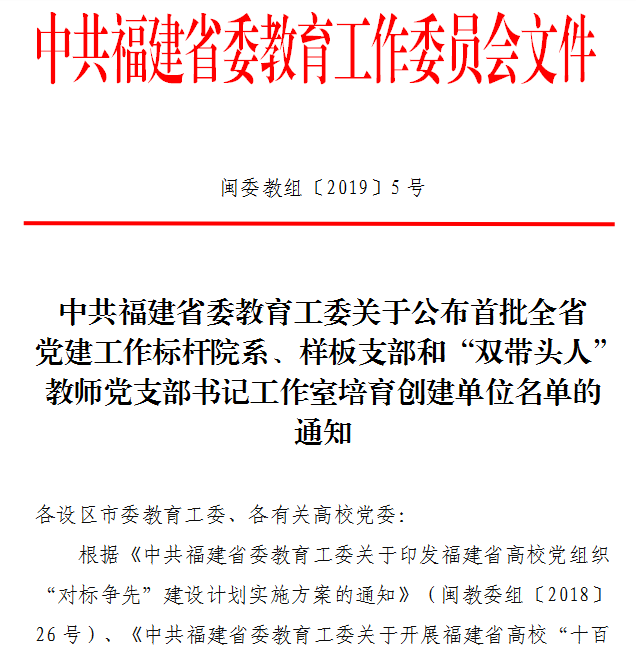 近日,根據(jù)《中共福建省委教育工委關(guān)于公布首批全省黨建工作標(biāo)桿院系、樣板支部和“雙帶頭人”教師黨支部書記工作室培育創(chuàng)建單位名單的通知》(閩委教組〔2019〕5號),我院護(hù)理系黨總支入選全省黨建工作標(biāo)桿院系培育創(chuàng)建單位,護(hù)理系第一黨支部、藥學(xué)系第一黨支部、醫(yī)學(xué)技術(shù)系第一黨支部、管理系學(xué)生黨支部、臨床醫(yī)學(xué)系第三黨支部入選全省黨建工作樣板支部培育創(chuàng)建單位。