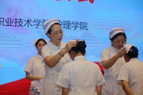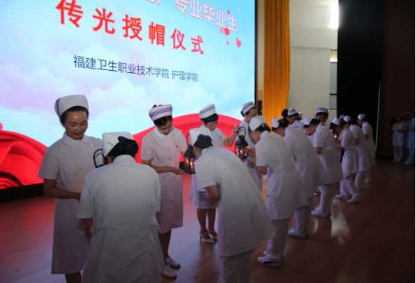 緊接著伴隨著柔美的音樂進行神圣的授帽傳光儀式。在護理學創(chuàng)始人南丁格爾像前,護理前輩們?yōu)閱蜗ス蛑漠厴I(yè)生逐一戴上象征著圣潔天使的燕尾帽,畢業(yè)生接過前輩手中象征南丁格爾精神的奉獻之火。白色的燕尾帽在紅色燭光的映襯下,猶如神圣的光環(huán)照耀在每一個現(xiàn)場師生的心中。