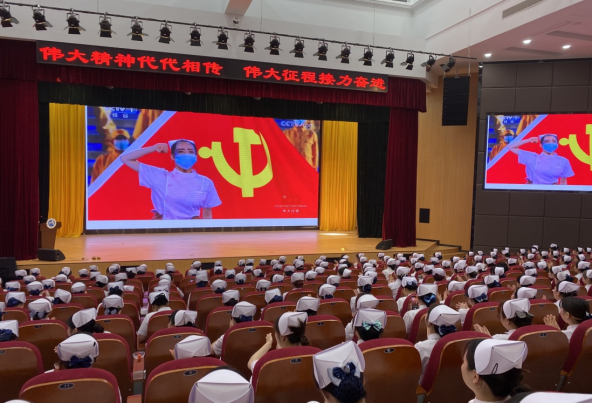 接著,全體畢業(yè)生一同欣賞慶祝中國共產(chǎn)黨成立100周年文藝演出《偉大征程》情景交響歌舞《人民至上》精彩剪輯。一身白衣,一頂燕尾帽,一句誓詞,今天的傳光授帽,傳承的不僅僅是敬佑生命、救死扶傷、甘于奉獻、大愛無疆的南丁格爾精神,更重要的是傳承我們中國護理人在中國共產(chǎn)黨的領(lǐng)導(dǎo)下,投身偉大戰(zhàn)疫實踐中所形成的人民至上、生命至上、舍生忘死、不負重托的精神理念。