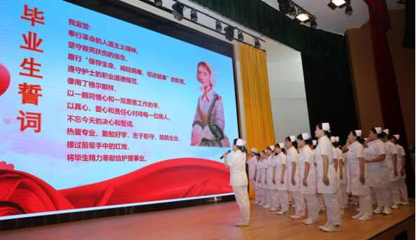 畢業(yè)生們手捧紅燭,舉起右手莊嚴宣誓:“……熱愛專業(yè),勤勉好學;忠于職守,兢兢業(yè)業(yè);接過前輩手中的紅燭,將畢生精力奉獻給護理事業(yè)……”鏗鏘有力的聲音久久縈繞在會場上空,昭示著她們正式加入白衣天使的行列。