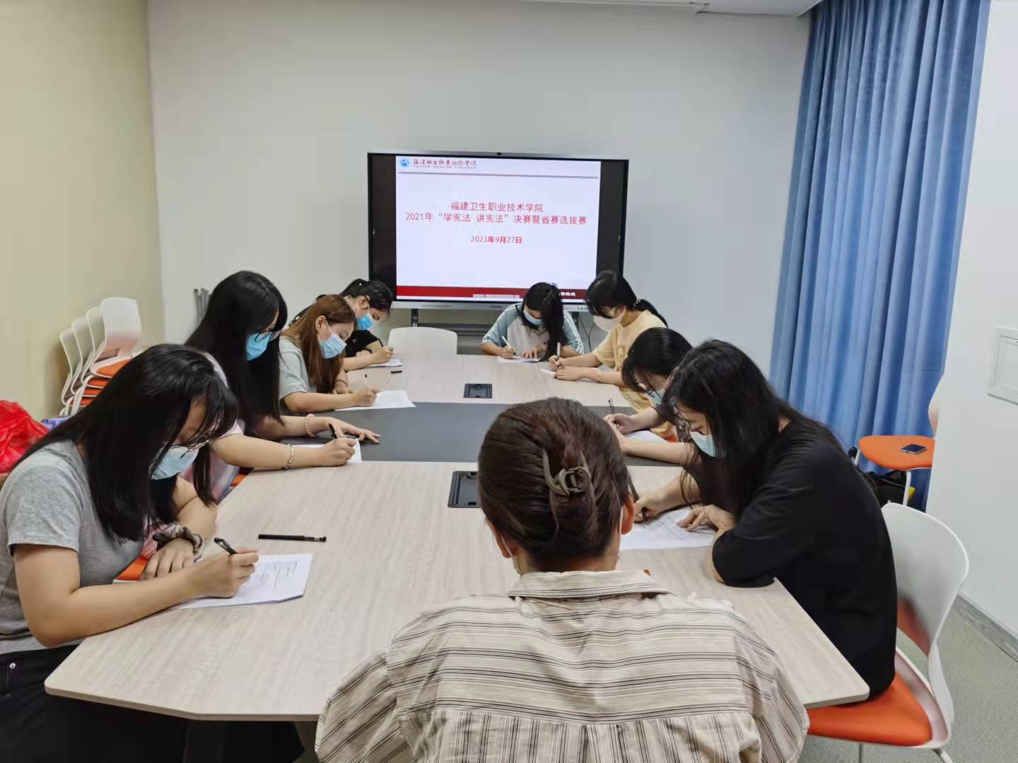 9月27日,“學(xué)憲法 講憲法”主題知識競賽暨演講比賽在學(xué)生服務(wù)中心活動室成功舉辦。本次比賽共有來自5個院系的30位同學(xué)參與其中。其中知識競賽采用筆試形式進行,全程閉卷考試,內(nèi)容涉及廣泛,旨在以考促學(xué),以學(xué)促進。參賽選手前期均認真?zhèn)淇?,考試過程中仔細思考,認真作答,考場秩序井然。同時,演講比賽選手們依次登臺亮相展現(xiàn)演講風(fēng)采,他們圍繞憲法主題,結(jié)合黨史知識、民法典、誠實守信等內(nèi)容,援引身邊有關(guān)憲法的故事、相關(guān)社會熱點、新聞事件等方面來詮釋學(xué)法、守法、懂法的重要性和必要性。最終,醫(yī)學(xué)技術(shù)系20影像301班王晶晶同學(xué)摘得知識競賽冠軍,藥學(xué)院20藥學(xué)303班畢思思榮獲演講比賽冠軍。本次比賽勝出的冠軍選手,將代表學(xué)校參加第六屆全省學(xué)生“學(xué)憲法 講憲法”比賽。