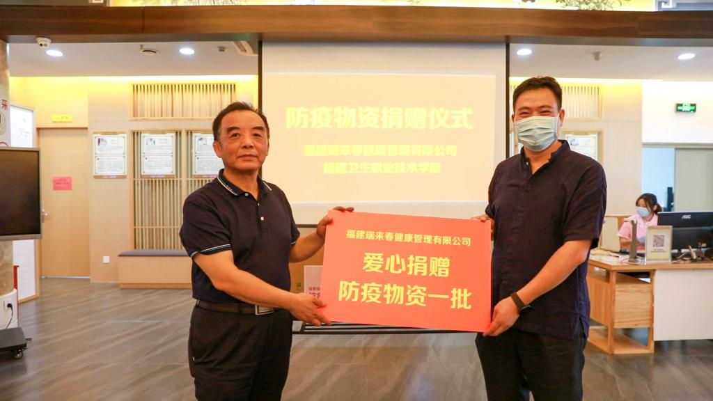 捐贈(zèng)儀式由何舒瀾主持,游鋒代表我校接受福建瑞來春健康管理有限公司捐贈(zèng)的一批防疫物資。