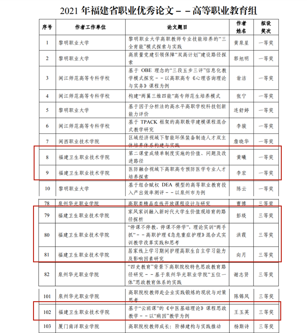 近日,在福建省職業(yè)技術(shù)教育中心組織的2021年福建省職業(yè)教育優(yōu)秀論文征集評(píng)選活動(dòng)中,我校有6篇論文獲獎(jiǎng)。黃曦老師的《第二課堂成績(jī)單制度實(shí)施的價(jià)值、問(wèn)題及改進(jìn)路徑》、李宏老師的《醫(yī)防融合視域下高職高專預(yù)防醫(yī)學(xué)專業(yè)人才培養(yǎng)探索》榮獲一等獎(jiǎng);彭琰老師的《家風(fēng)家訓(xùn)融入新時(shí)代大學(xué)生價(jià)值觀培育的路徑探析》、洪霞老師的《“停課不停教,停課不停學(xué)”,理論實(shí)訓(xùn)“兩手抓”--高職護(hù)理<急危重癥護(hù)理>混合式實(shí)訓(xùn)教學(xué)改革實(shí)踐和思考》、向月老師的《居家線上學(xué)習(xí)期間護(hù)理高職生自主學(xué)習(xí)能力及影響因素研究》、王玉英老師的《基于“云班課”的<中醫(yī)基礎(chǔ)理論>課程思政教學(xué)--以“病因”教學(xué)為例》榮獲三等獎(jiǎng)。