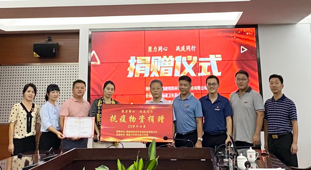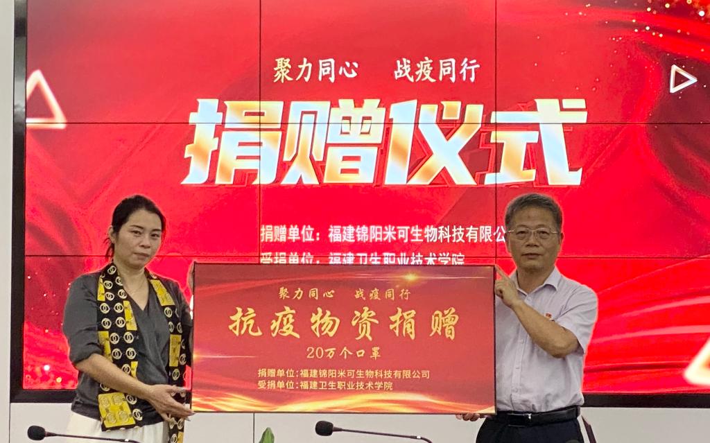 聚力同心,戰(zhàn)疫同行。福建錦陽米可生物科技有限公司向我校捐贈20萬個口罩,健康管理系黨總支第二支部牽線搭橋,攜手為學(xué)校疫情常態(tài)化防控工作保駕護航。