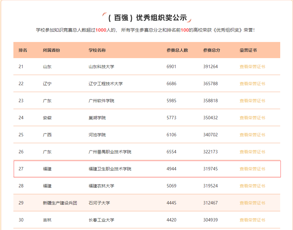 據(jù)悉,本次競賽所用試卷由“學習強國”上海學習平臺提供,共吸引了廈門大學、暨南大學、石河子大學、廣州大學等全國848所高校54.6萬學生參賽。我校約5000名學生參與競賽,近4000名完成學習、競賽任務(wù),獲得《電子學習證書》,位列全國第27名、全省高校第3名、全省高職院校第1名。