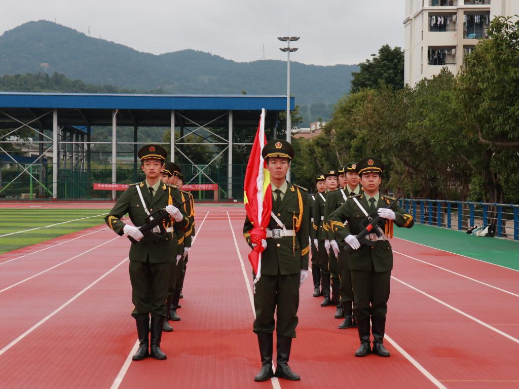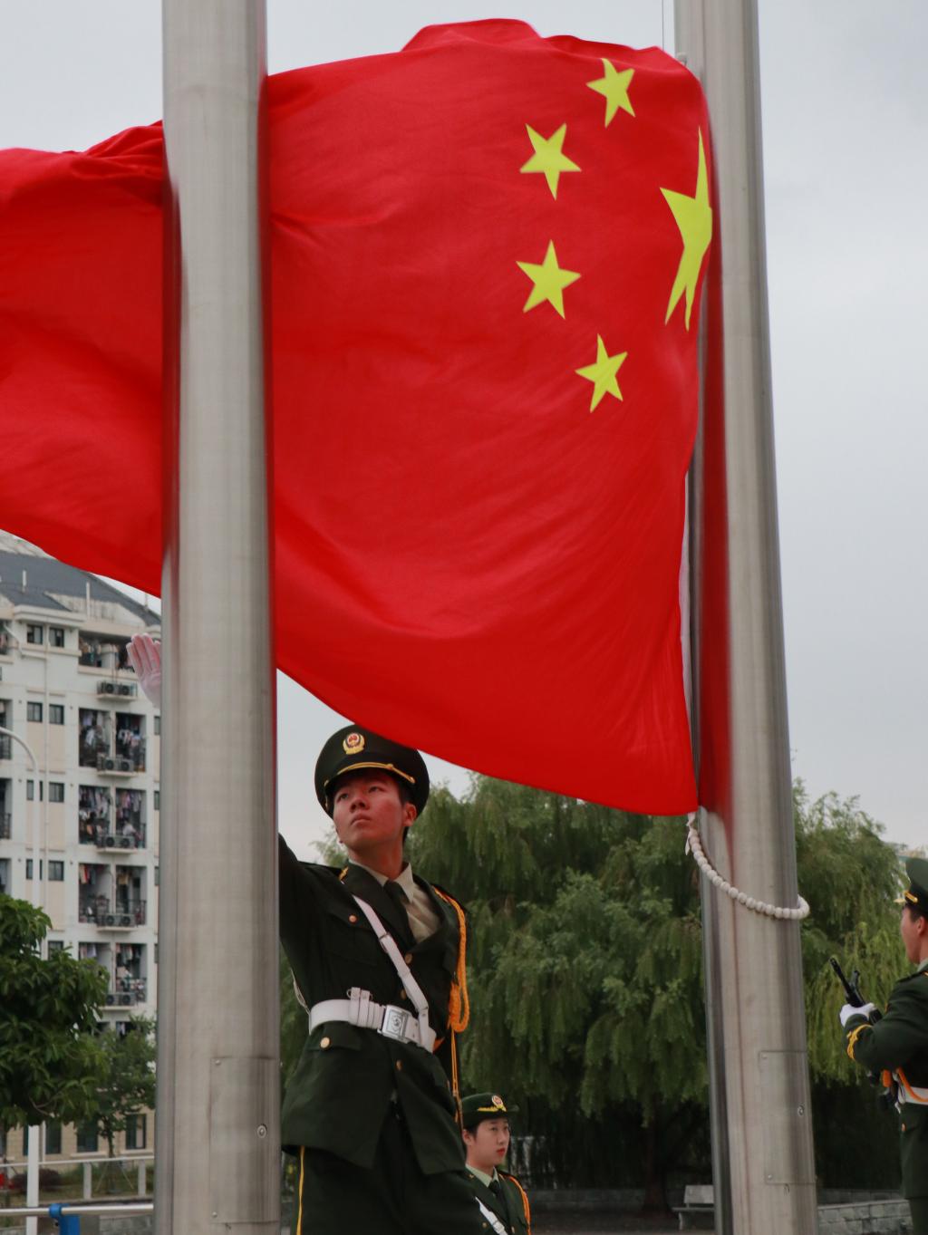 隨著國(guó)旗護(hù)衛(wèi)隊(duì)矯健有力的步伐,雄壯的國(guó)歌聲響起,典禮正式拉開序幕。向著秋雨洗禮過(guò)后的清空,五星紅旗冉冉升起,全體師生向國(guó)旗敬禮。