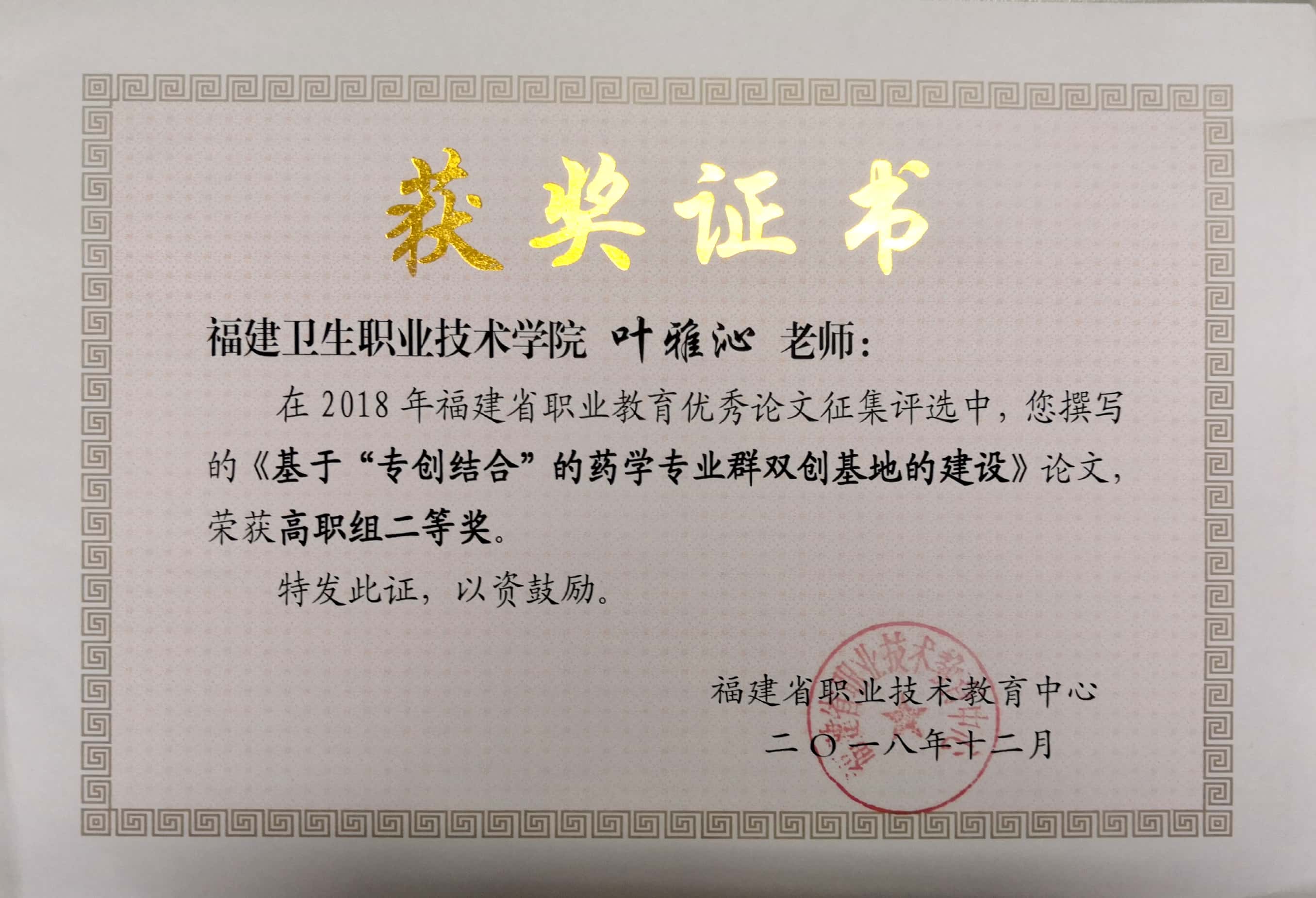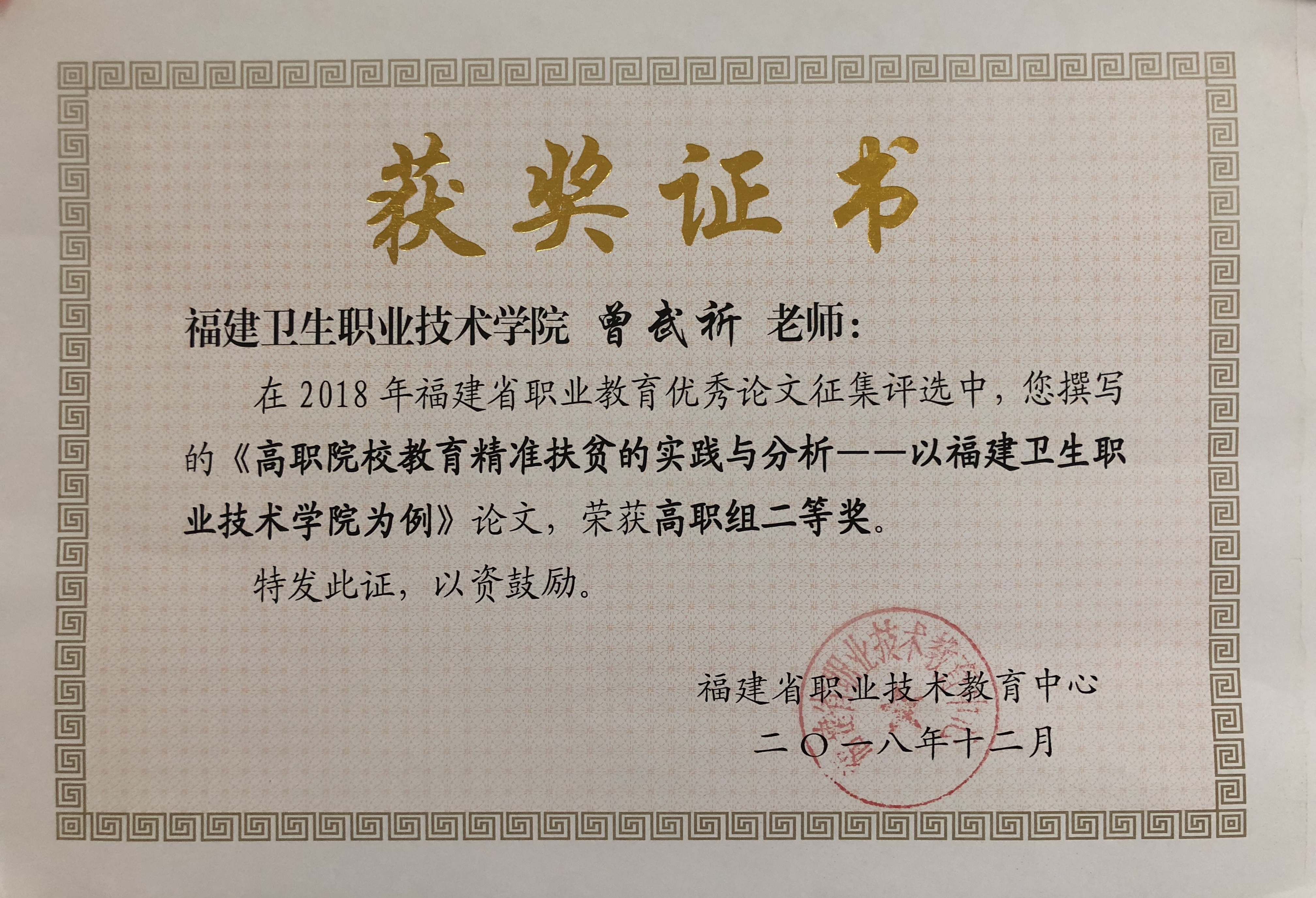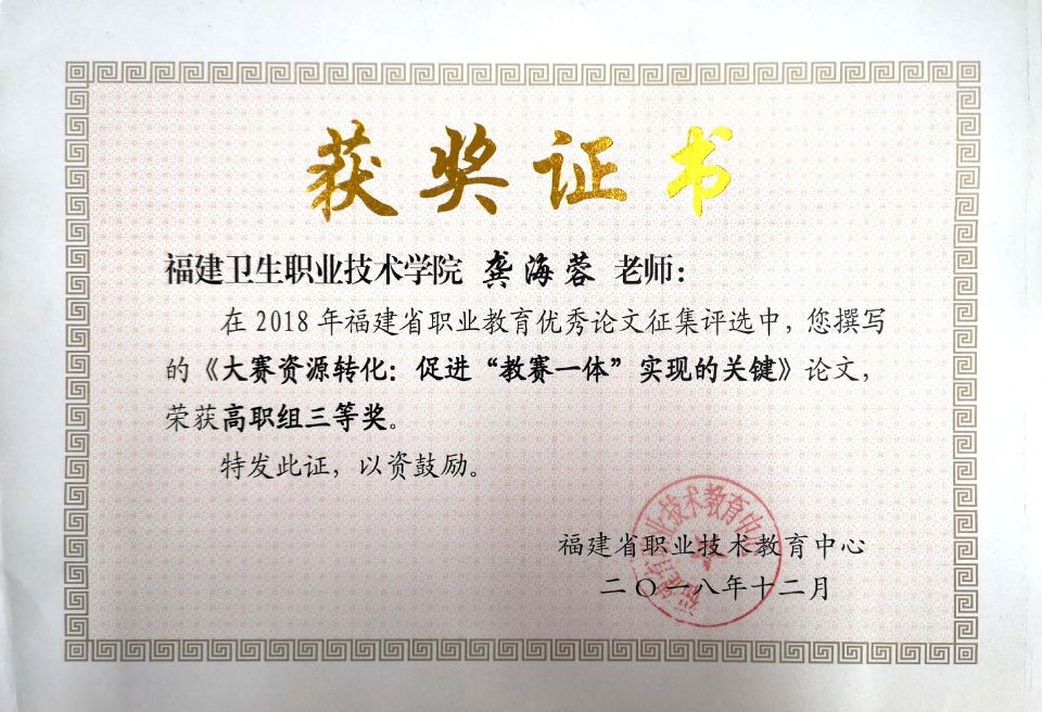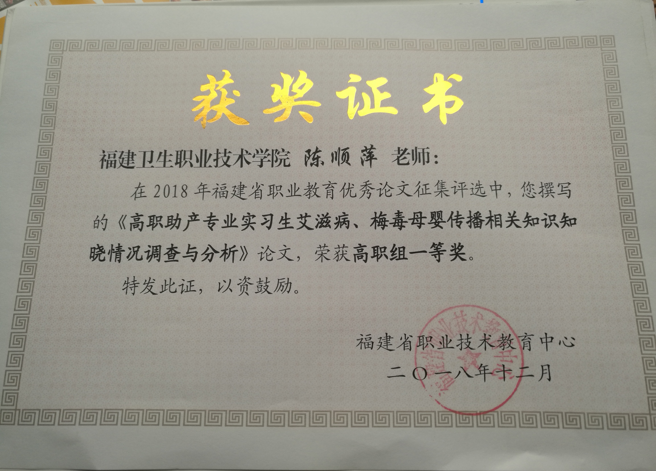 根據(jù)福建省職業(yè)技術(shù)教育中心的評(píng)選結(jié)果,陳順萍老師撰寫(xiě)的論文《高職助產(chǎn)實(shí)習(xí)生艾滋病、梅毒母嬰傳播相關(guān)知識(shí)知曉情況調(diào)查與分析》喜獲2018年福建省職業(yè)教育優(yōu)秀論文評(píng)選高職組一等獎(jiǎng);曾武祈書(shū)記撰寫(xiě)的論文《高職院校教育精準(zhǔn)扶貧的實(shí)踐與分析——以福建衛(wèi)生職業(yè)技術(shù)學(xué)院為例》、葉雅沁老師撰寫(xiě)的論文《基于“專(zhuān)創(chuàng)結(jié)合”的藥學(xué)專(zhuān)業(yè)群雙創(chuàng)基地的建設(shè)》喜獲2018年福建省職業(yè)教育優(yōu)秀論文評(píng)選高職組二等獎(jiǎng);龔海蓉老師撰寫(xiě)的論文《大賽資源轉(zhuǎn)化:促進(jìn)“教賽一體”實(shí)現(xiàn)的關(guān)鍵》喜獲2018年福建省職業(yè)教育優(yōu)秀論文評(píng)選高職組三等獎(jiǎng)。