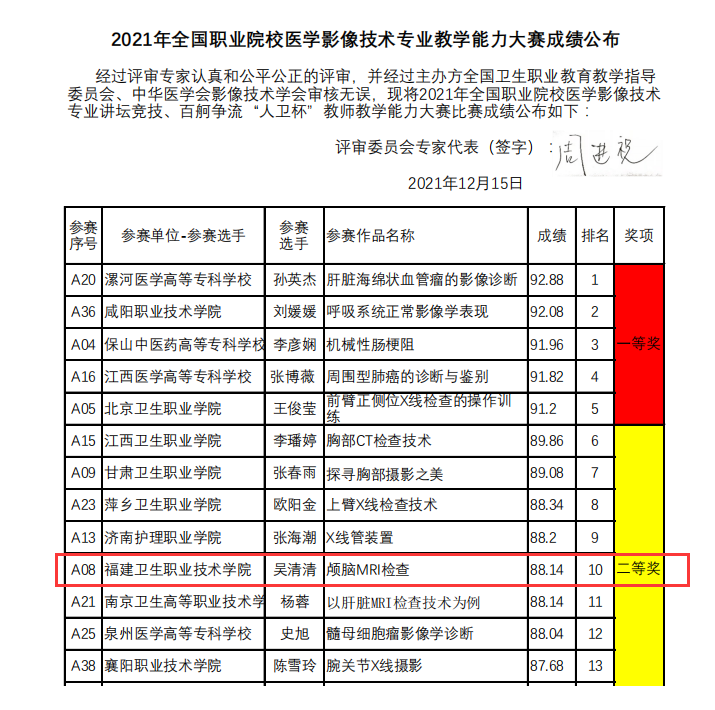 12月15日,由全國衛(wèi)生職業(yè)教育教學(xué)指導(dǎo)委員會、中華醫(yī)學(xué)會影像技術(shù)分會主辦的2021年全國職業(yè)院校醫(yī)學(xué)影像技術(shù)專業(yè)教學(xué)能力大賽總成績公布,我校醫(yī)學(xué)技術(shù)系吳清清老師的參賽作品《顱腦MRI檢查》榮獲二等獎(jiǎng)。