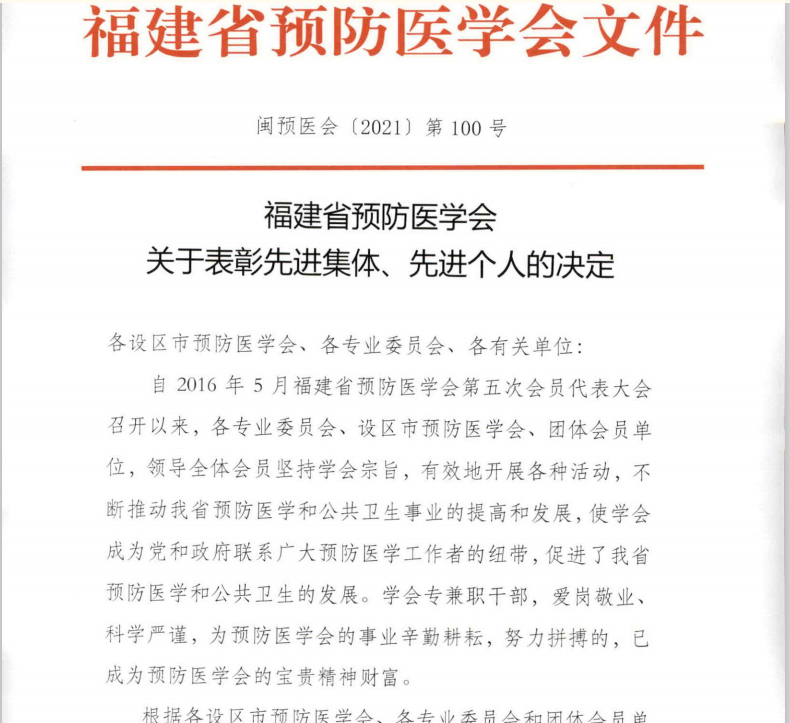 近日,福建省預(yù)防醫(yī)學(xué)會(huì)發(fā)布表彰決定,我校李宏老師榮獲2021年福建省預(yù)防醫(yī)學(xué)會(huì)“先進(jìn)個(gè)人”榮譽(yù)稱號(hào)。