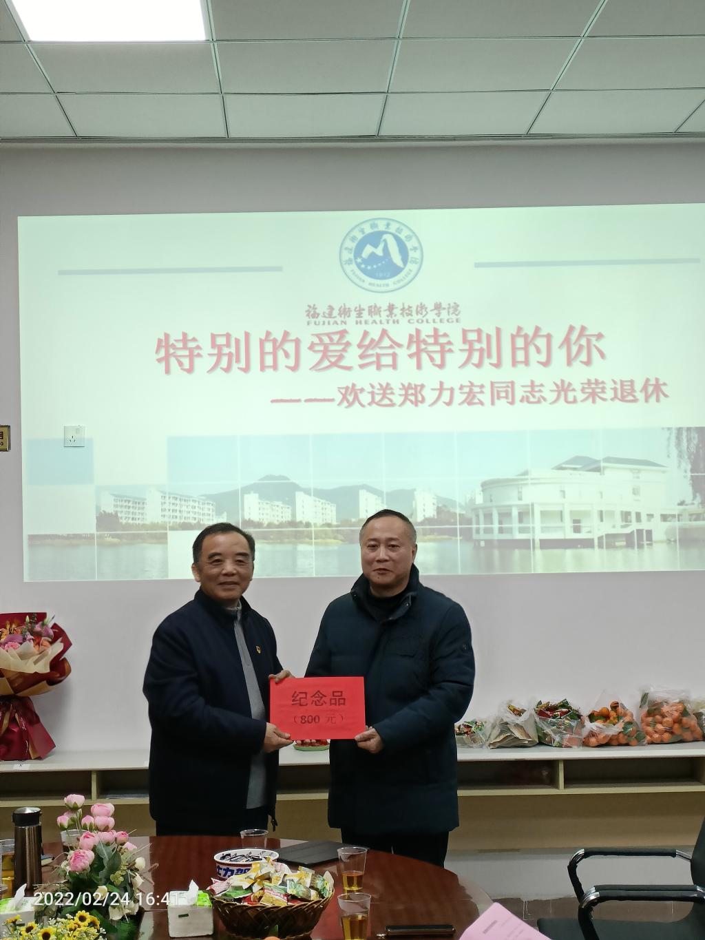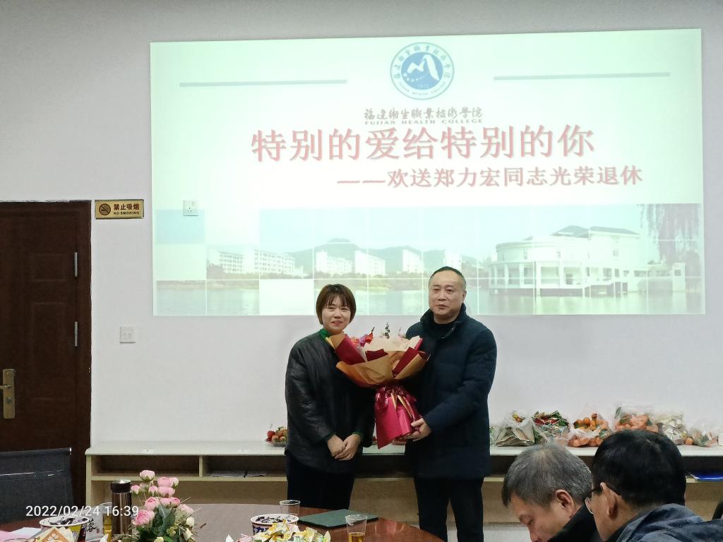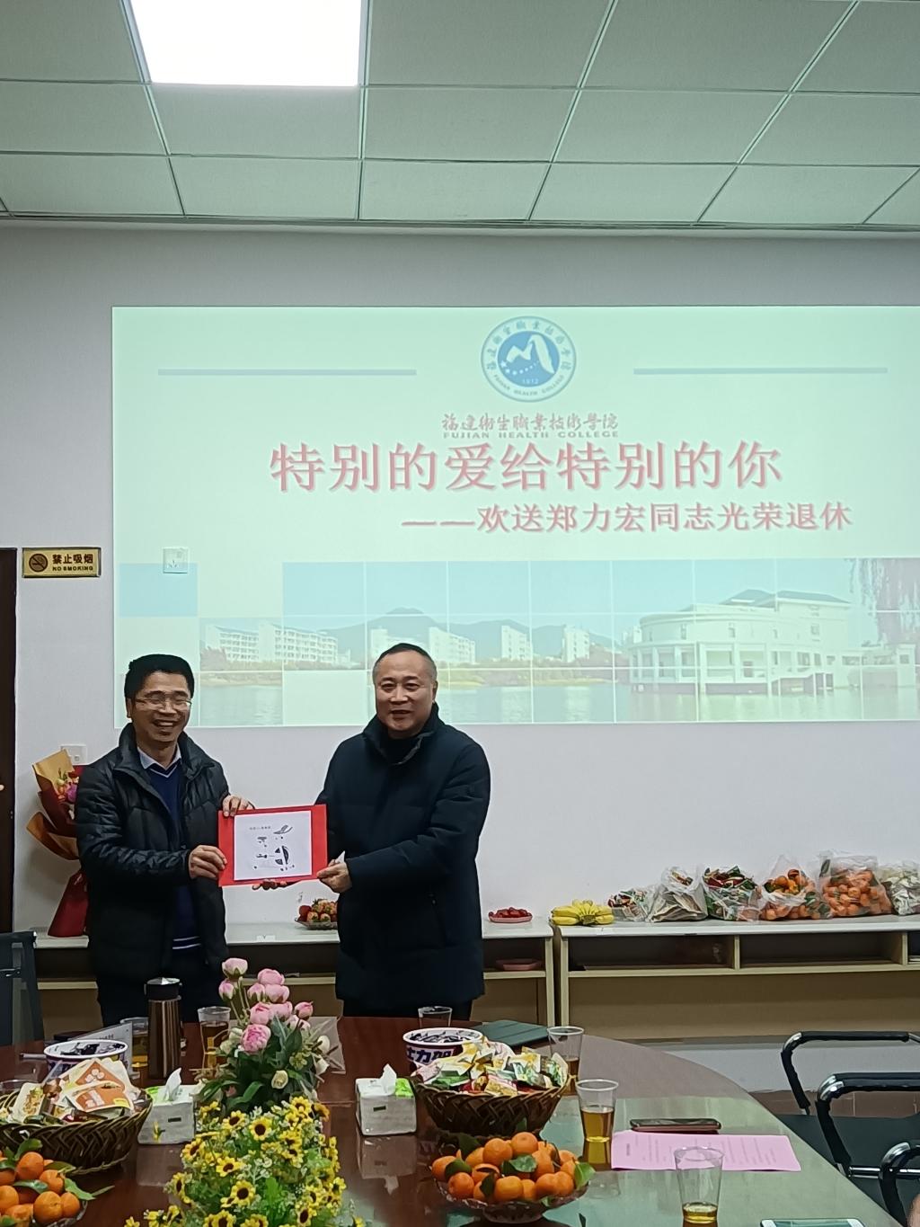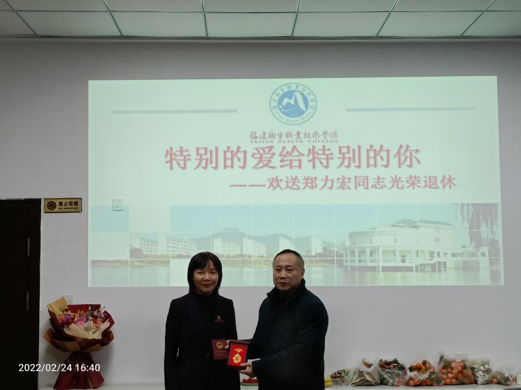 李美華代表學(xué)校向鄭力宏頒發(fā)退休證書和退休紀(jì)念章。