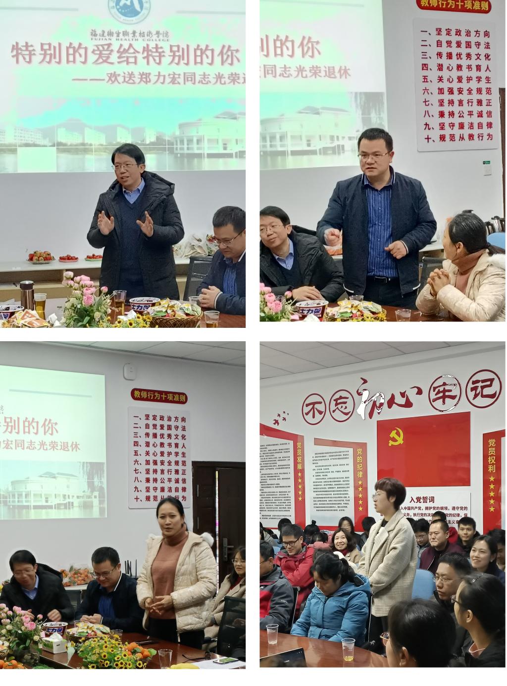 最后,游鋒代表學(xué)校黨委發(fā)言,他希望鄭力宏同志退休不退志,離崗不離心,卸任不卸責(zé),在開啟退休生活新征程上,一如既往地關(guān)心和支持學(xué)校事業(yè)的發(fā)展,持續(xù)發(fā)光發(fā)熱。