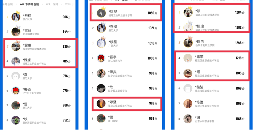 在體能賽周賽中,我校學(xué)生多次獲得佳績,在下蹲開合跳和深蹲項目中成績尤為突出,多名同學(xué)名列前十榜內(nèi)。