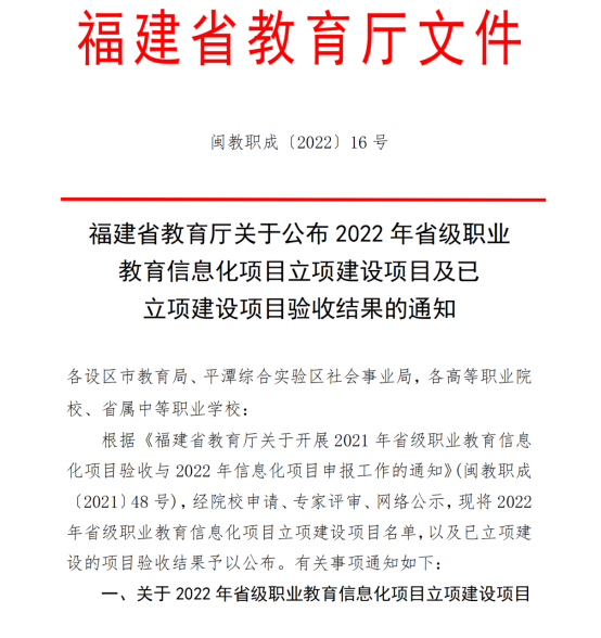 近日,福建省教育廳公布2022年省級(jí)職業(yè)教育信息化項(xiàng)目立項(xiàng)建設(shè)項(xiàng)目名單和已立項(xiàng)建設(shè)項(xiàng)目驗(yàn)收結(jié)果,我校5個(gè)項(xiàng)目獲批立項(xiàng),3個(gè)項(xiàng)目通過驗(yàn)收。