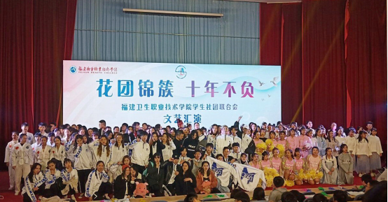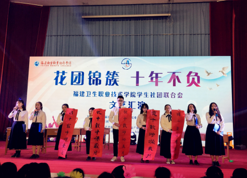 十年風(fēng)雨,我們砥礪前行;十年艱辛,我們攜手并進(jìn);十年成果,我們共同見證。12月28日,在學(xué)生社團(tuán)聯(lián)合會(huì)十周年生日來臨之際,為增強(qiáng)學(xué)生社團(tuán)聯(lián)合會(huì)的凝聚力,更好地傳承社聯(lián)文化,學(xué)生社團(tuán)聯(lián)合會(huì)舉辦“花團(tuán)錦簇,十年不負(fù)”十周年慶典暨元旦文藝匯演。學(xué)院黃銘珊副院長(zhǎng)、團(tuán)委黃曦書記、圖書館副館長(zhǎng)宋愛艷老師、醫(yī)學(xué)技術(shù)系黨總支邱滾忠副書記、護(hù)理系黨總支林桂松副書記、基礎(chǔ)部外語教研室主任黃光惠老師以及各系的團(tuán)總支書記、輔導(dǎo)員、師生代表400余人觀看了晚會(huì)。