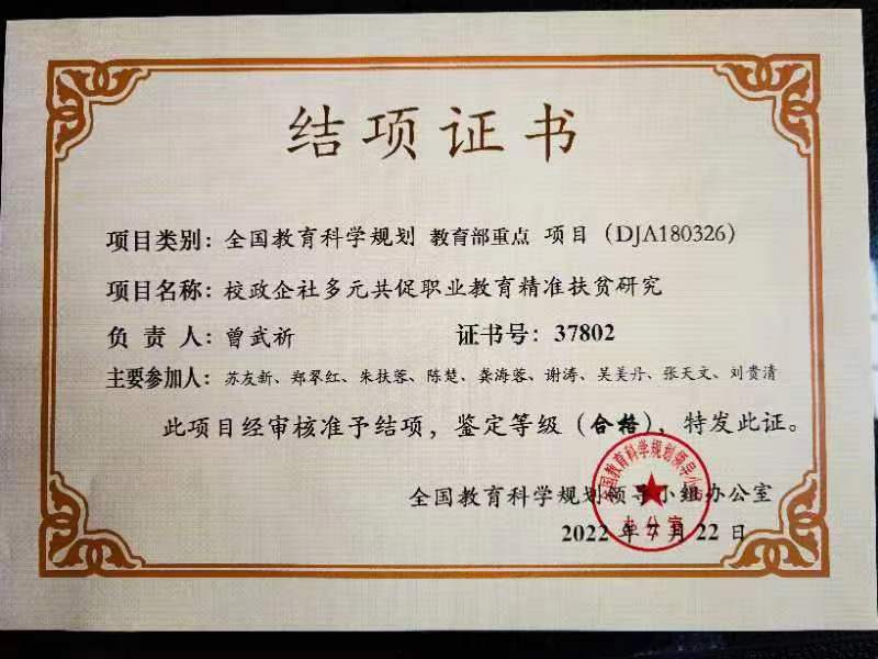近日,全國教育科學(xué)規(guī)劃領(lǐng)導(dǎo)小組辦公室公布了2022年全國教育科學(xué)規(guī)劃立項(xiàng)課題鑒定情況。我校黨委書記曾武祈主持的課題《校政企社多元共促職業(yè)教育精準(zhǔn)扶貧研究》通過鑒定,順利結(jié)題。