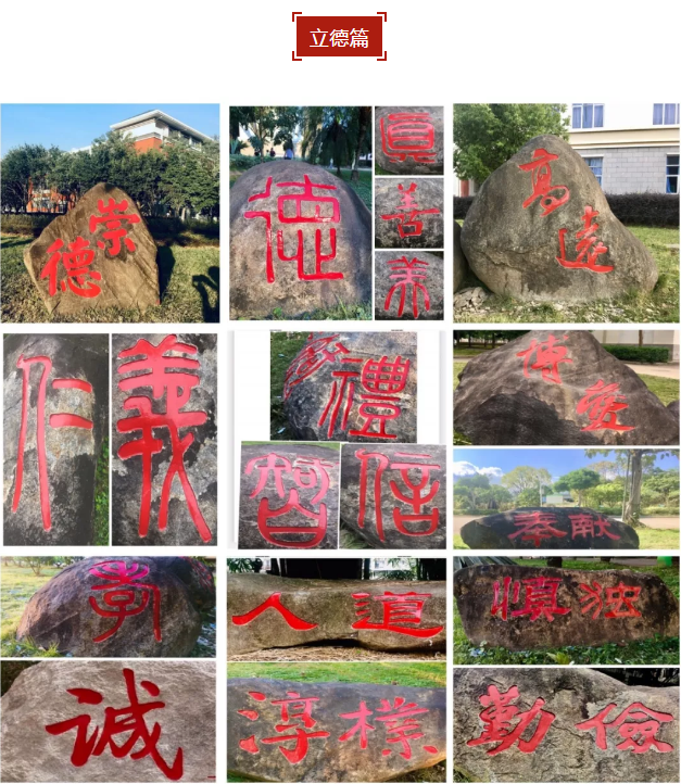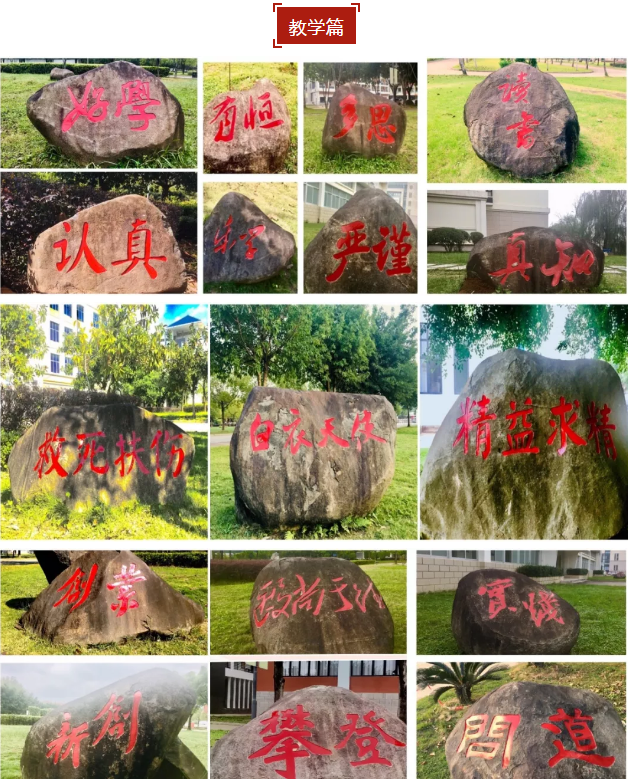 近日,有“福州市最美單位庭院”之譽(yù)的福建衛(wèi)生職業(yè)技術(shù)學(xué)院又添新景——校園文化系列石刻。72幅石刻點(diǎn)綴在校園不同區(qū)域綠樹(shù)花草之間,各顯風(fēng)采,相映生輝。石刻內(nèi)容分“立德篇、教學(xué)篇、行政篇、青春篇”四大主題,析理悟理、明志勵(lì)志、催人奮進(jìn);石刻書(shū)法篆隸行楷草俱全,多為名帖名家書(shū)法集字而成,彰顯中國(guó)書(shū)法獨(dú)特魅力。