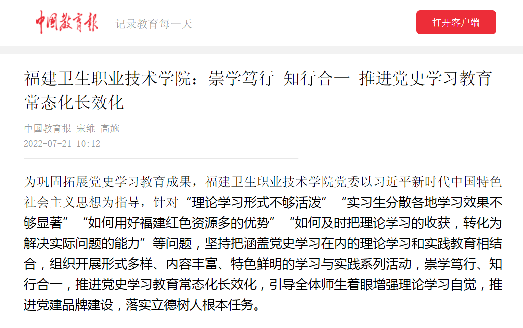 《福建衛(wèi)生職業(yè)技術(shù)學(xué)院:崇學(xué)篤行 知行合一 推進(jìn)黨史學(xué)習(xí)教育常態(tài)化長(zhǎng)效化》(2022年7月21日)