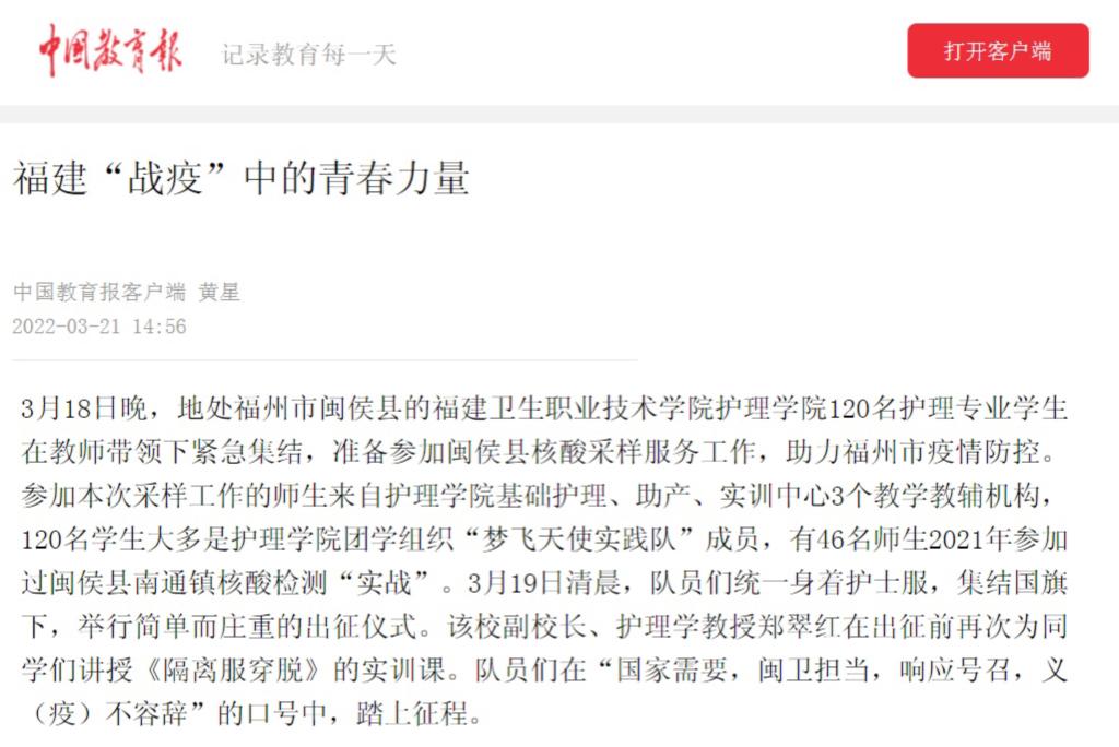 《福建“戰(zhàn)疫”中的青春力量》(福建衛(wèi)生職業(yè)技術(shù)學(xué)院護(hù)理學(xué)院120名護(hù)理專業(yè)學(xué)生參加閩侯縣核酸采樣服務(wù)工作,助力福州市疫情防控)(2022年3月21日)