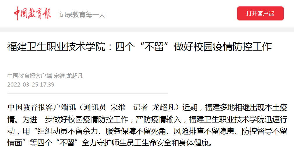 《福建衛(wèi)生職業(yè)技術(shù)學(xué)院:四個(gè)“不留”做好校園疫情防控工作》(2022年3月25日)