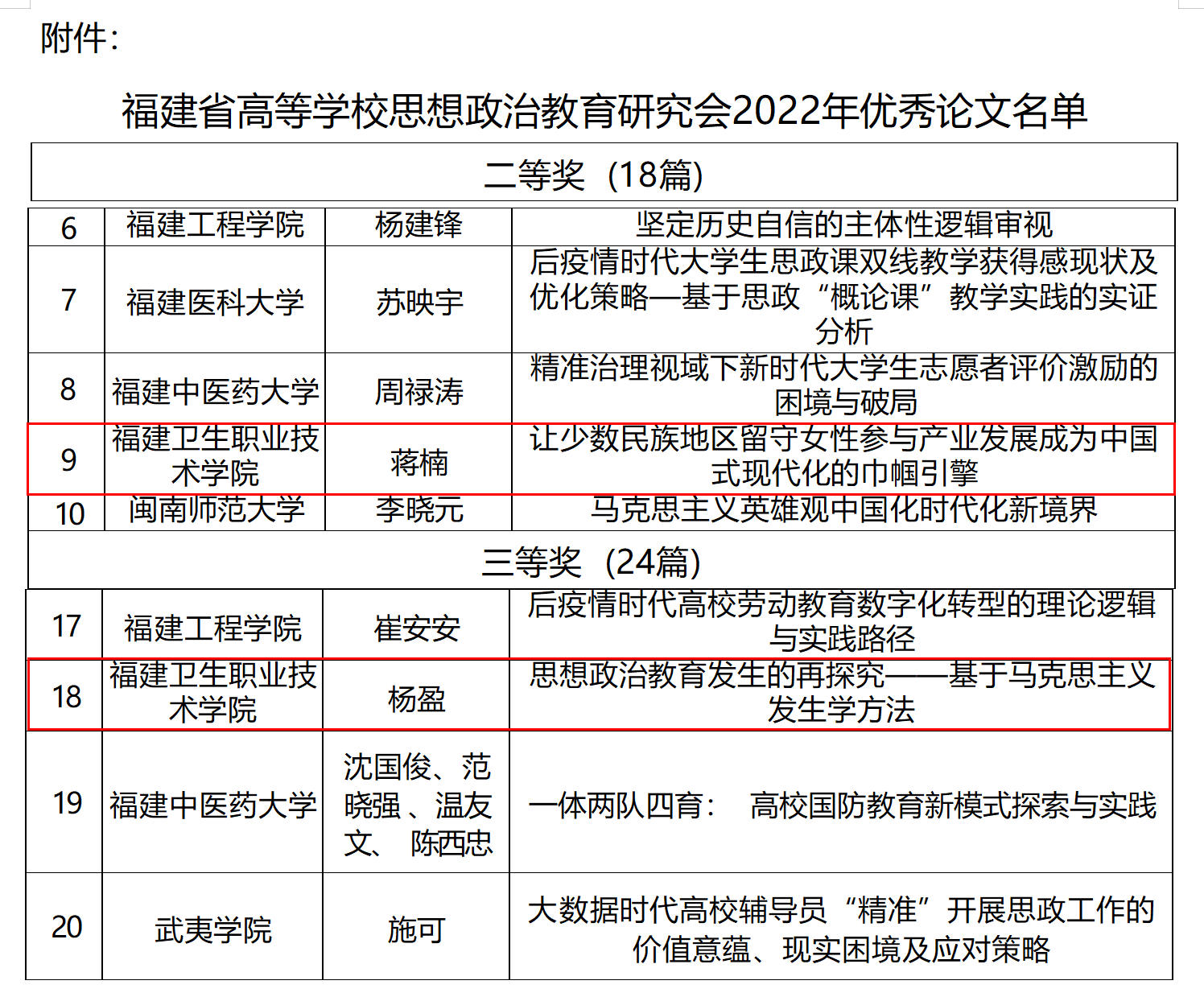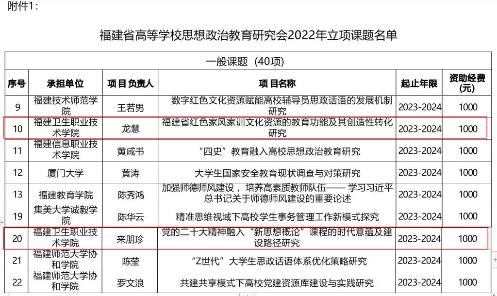 近日,福建省高等學(xué)校思想政治教育研究會公布了2022年優(yōu)秀工作案例、優(yōu)秀論文評選結(jié)果和課題立項(xiàng)名單。我校思想政治教育成果再獲佳績,《“一核四色四維”社會實(shí)踐育人模式的構(gòu)建與實(shí)施》(項(xiàng)目成員:熊美蘭、吳薇、羅蕓、來朋珍、林桂松)榮獲優(yōu)秀工作案例二等獎;論文《讓少數(shù)民族地區(qū)留守女性參與產(chǎn)業(yè)發(fā)展成為中國式現(xiàn)代化的巾幗引擎》(作者:蔣楠)、《思想政治教育發(fā)生的再探究——基于馬克思主義發(fā)生學(xué)方法》(作者:楊盈)分別榮獲二等獎、三等獎;課題《福建省紅色家風(fēng)家訓(xùn)文化資源的教育功能及其創(chuàng)造性轉(zhuǎn)化研究》(負(fù)責(zé)人:龍慧)和《黨的二十大精神融入“新思想概論”課程的時(shí)代意蘊(yùn)及建設(shè)路徑研究》(負(fù)責(zé)人:來朋珍)獲得立項(xiàng)。