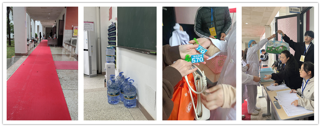 考試期間恰逢大雨等惡劣天氣,學(xué)校為此做了充足準(zhǔn)備,為考生提供暖心服務(wù)。在考場(chǎng)入口處搭建帳篷,擺放防滑地毯;設(shè)置咨詢室及物品存放室,為考生提供咨詢、打印、存取行李等服務(wù);候考室配備飲水機(jī);沿途設(shè)置引導(dǎo)標(biāo)識(shí)牌、考場(chǎng)平面圖,考生從入校到離校各環(huán)節(jié)均有志愿者引導(dǎo)提供幫助。