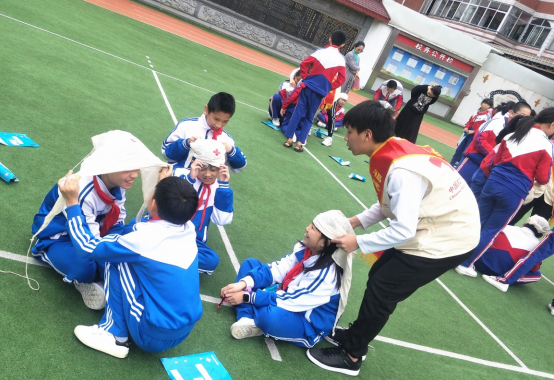 “記住要領(lǐng),三角巾底邊反折兩橫指,正中點(diǎn)置于眉毛上,頂角位于枕后,兩底角經(jīng)耳上拉緊到后腦勺交叉……”福建衛(wèi)生職業(yè)技術(shù)學(xué)院大學(xué)生紅十字科普志愿者一遍遍強(qiáng)調(diào)著動(dòng)作要領(lǐng),糾正小學(xué)生的動(dòng)作。小學(xué)生們認(rèn)真練習(xí),不時(shí)還向志愿者哥哥姐姐們提問(wèn)請(qǐng)教。小學(xué)生們認(rèn)真學(xué)習(xí)著三角巾頭部包扎、大小懸臂包扎等包扎技能。