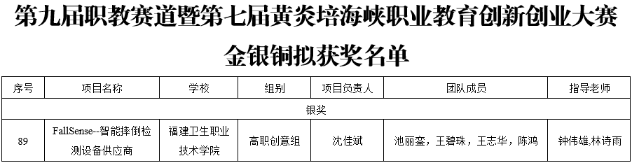 近日,第九屆福建省“互聯(lián)網(wǎng)+”大學(xué)生創(chuàng)新創(chuàng)業(yè)大賽職教賽道暨第七屆黃炎培海峽職業(yè)教育創(chuàng)新創(chuàng)業(yè)大賽在黎明職業(yè)大學(xué)舉行。我校報(bào)送的參賽項(xiàng)目《FallSense——智能摔倒檢測設(shè)備供應(yīng)商》在省賽網(wǎng)評中勝出,參加本次現(xiàn)場決賽并獲得銀獎(jiǎng)。