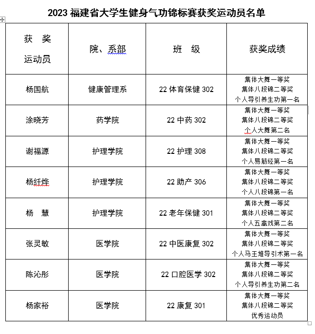 在體育部體育教研室主任李通,教練黃躍、林玉平、連期待的帶領(lǐng)下,我校健身氣功隊(duì)8名隊(duì)員以飽滿的熱情,昂揚(yáng)的斗志在比賽場上充分展現(xiàn)了自己的實(shí)力和風(fēng)采,最終獲得五金、四銀、團(tuán)體總分第二的好成績,展示了我校學(xué)生健康向上的精神風(fēng)貌。