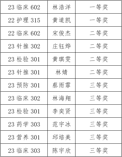 最終,23級臨床(高本貫通)專業(yè)林浩洋、22級護理專業(yè)黃道凱等同學在比賽中取得了優(yōu)異的成績,分別榮獲一、二、三等獎。