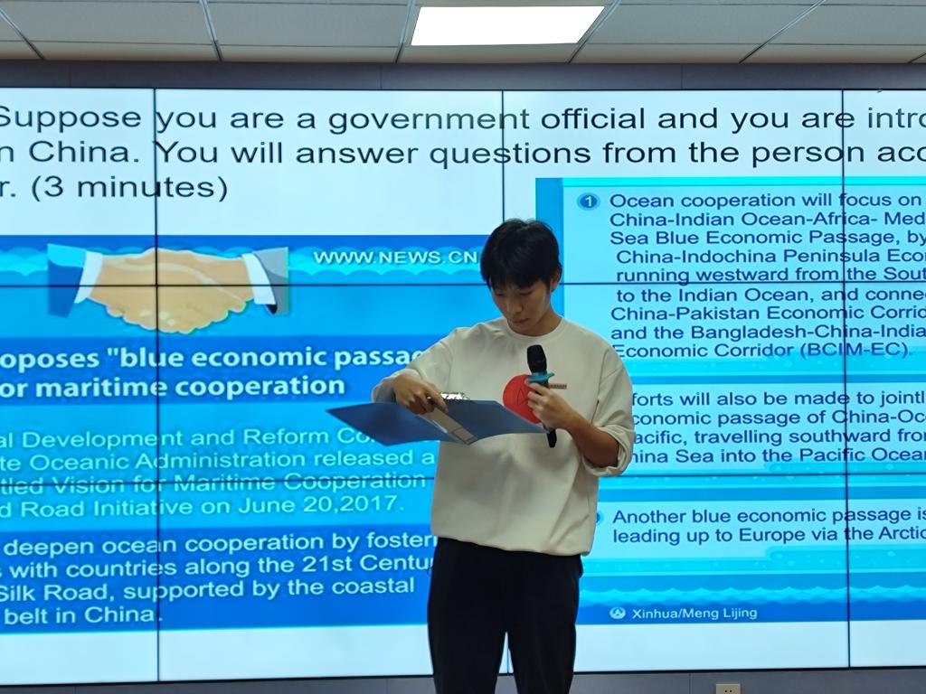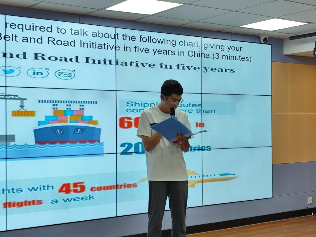 本次比賽共有200多名選手在初賽中進行激烈地角逐,選手們表現(xiàn)優(yōu)異、各放異彩,共有12名選手從中脫穎而出,進入決賽。為了讓入圍選手最大限度發(fā)揮自己的水平,老師們在賽前對參賽選手多次開展指導活動。決賽中,12名選手通過“現(xiàn)場描述”和“情景交流”兩個環(huán)節(jié)綻放光彩,用英文講述了我國“一帶一路”倡議,加深了對祖國共建共享規(guī)劃的認識,表達了我校學子對國家繁榮發(fā)展的密切關注與自豪之情。