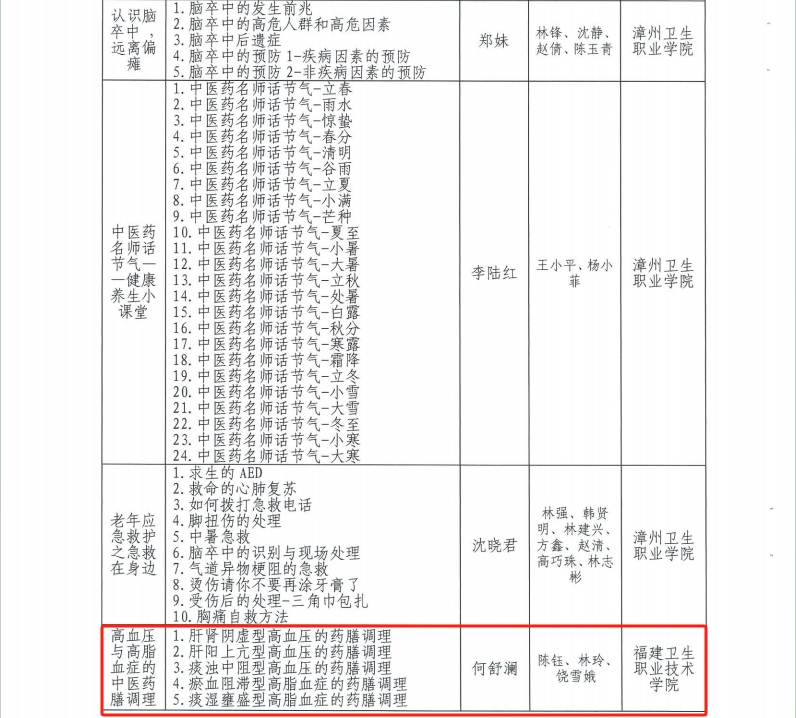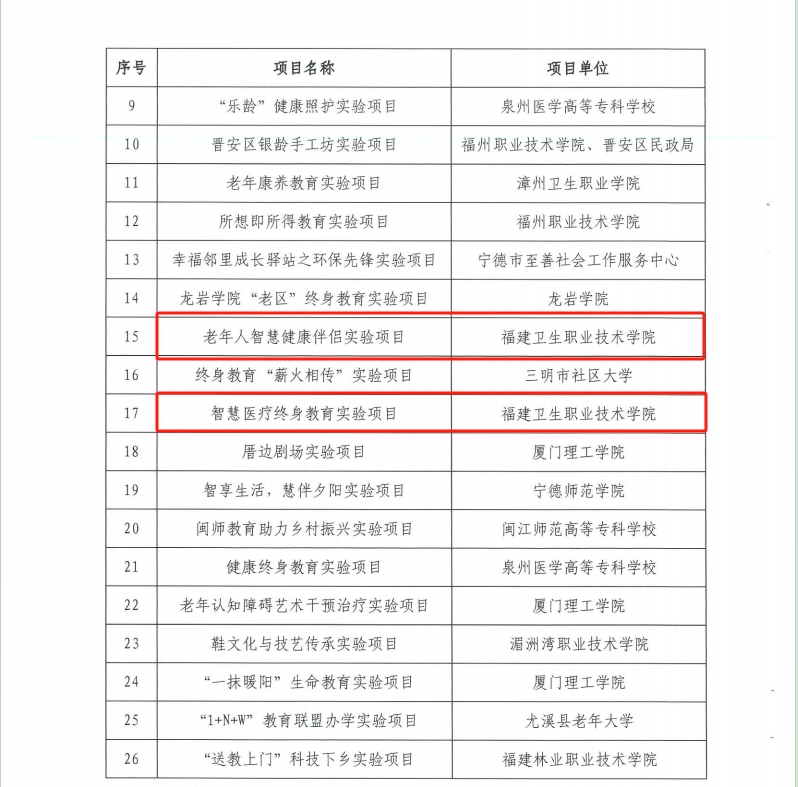 近日,福建省終身教育促進(jìn)委員會(huì)公布了2023年福建省終身教育提質(zhì)培優(yōu)項(xiàng)目,我校前期申報(bào)的4個(gè)項(xiàng)目成功入選,其中健康管理系陳愛(ài)珍老師申報(bào)的《基層公共衛(wèi)生終身教育創(chuàng)新基地》入選終身教育創(chuàng)新基地;醫(yī)學(xué)院林國(guó)威老師申報(bào)的《老年人智慧健康伴侶實(shí)驗(yàn)項(xiàng)目》、醫(yī)學(xué)技術(shù)系鐘偉雄老師申報(bào)的《智慧醫(yī)療終身教育實(shí)驗(yàn)項(xiàng)目》入選終身教育實(shí)驗(yàn)項(xiàng)目;教務(wù)處何舒瀾老師申報(bào)的《高血壓與高脂血癥的中醫(yī)藥膳調(diào)理》入選社區(qū)(老年)教育課程資源。