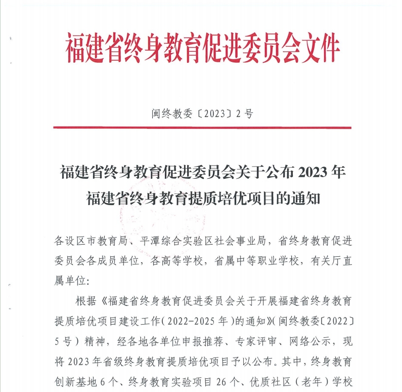 福建省終身教育提質(zhì)培優(yōu)項(xiàng)目是福建省貫徹中共中央、國(guó)務(wù)院《關(guān)于加強(qiáng)新時(shí)代老齡工作的意見(jiàn)》的重大舉措,旨在多渠道擴(kuò)大社區(qū)教育、老年教育資源供給,完善我省終身教育服務(wù)體系,打造具有福建特色的終身教育發(fā)展模式,助力“構(gòu)建服務(wù)全民終身學(xué)習(xí)的教育體系”。經(jīng)各地各單位申報(bào)推薦、專(zhuān)家評(píng)審、網(wǎng)絡(luò)公示,2023年福建省終身教育提質(zhì)培優(yōu)項(xiàng)目共入選終身教育創(chuàng)新基地6個(gè)、終身教育實(shí)驗(yàn)項(xiàng)目26個(gè)、優(yōu)質(zhì)社區(qū)(老年)學(xué)校(學(xué)習(xí)中心)18個(gè)、社區(qū)(老年)教育鄉(xiāng)土教材13冊(cè)、社區(qū)(老年)教育課程資源25門(mén)339講、高校老年大學(xué)4所、學(xué)習(xí)型社區(qū)(村)22個(gè)、終身教育重點(diǎn)研究課題立項(xiàng)3個(gè)、終身教育一般研究課題立項(xiàng)47個(gè)。