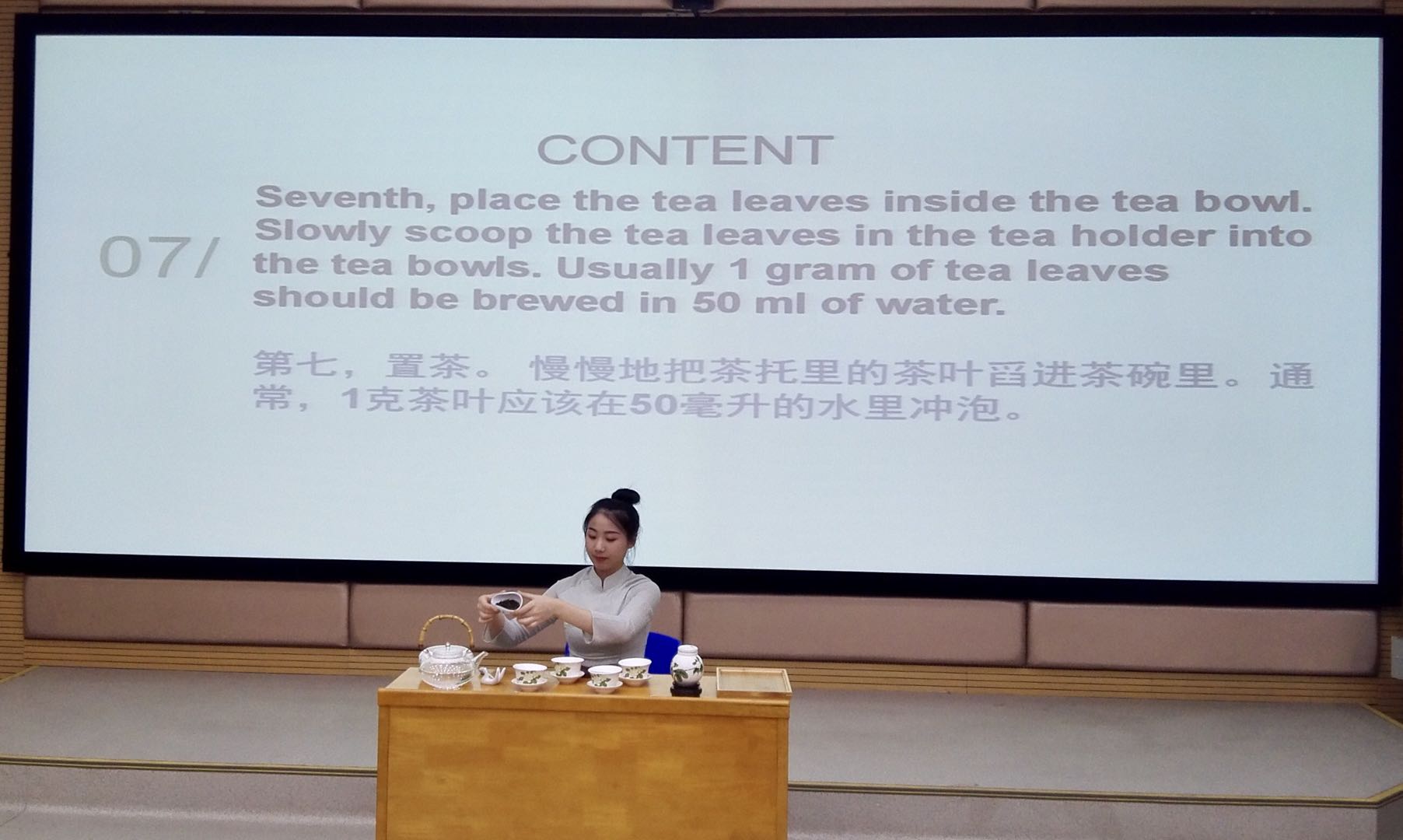 本次活動主要內(nèi)容有兩項:一是欣賞茶道表演和茶道專題英文演講,通過沏茶、賞茶、聞茶、飲茶、品嘗,美心修德,學習禮法,領略傳統(tǒng)文化之美。二是將茶文化與醫(yī)學專業(yè)相結(jié)合,通過英語演講分享關于茶葉的文化、成分、功效、保健等知識,讓傳統(tǒng)文化滲透到醫(yī)藥健康知識的傳播之中。