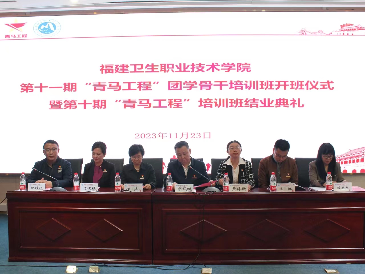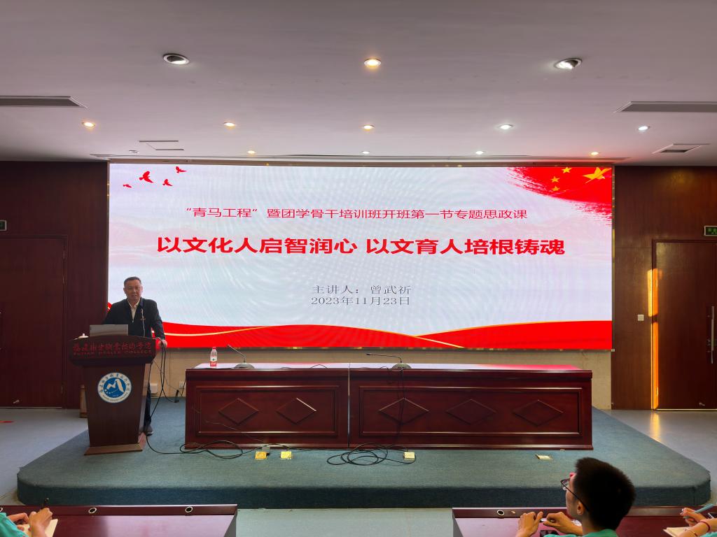 2023年11月23日下午,我校第十一期“青馬工程”團(tuán)學(xué)骨干培訓(xùn)班開班儀式暨第十期“青馬工程”團(tuán)學(xué)骨干培訓(xùn)班結(jié)業(yè)典禮在實(shí)訓(xùn)樓四樓報(bào)告廳順利舉行。校黨委書記曾武祈、副校長黃銘珊出席儀式,組織統(tǒng)戰(zhàn)部、宣傳部、學(xué)生工作部、馬克思主義學(xué)院、團(tuán)委、各院系黨團(tuán)組織負(fù)責(zé)人以及115名第十一期“青馬工程”學(xué)員參加儀式。儀式結(jié)束,曾武祈為青馬學(xué)員講授開班第一節(jié)專題思政課。