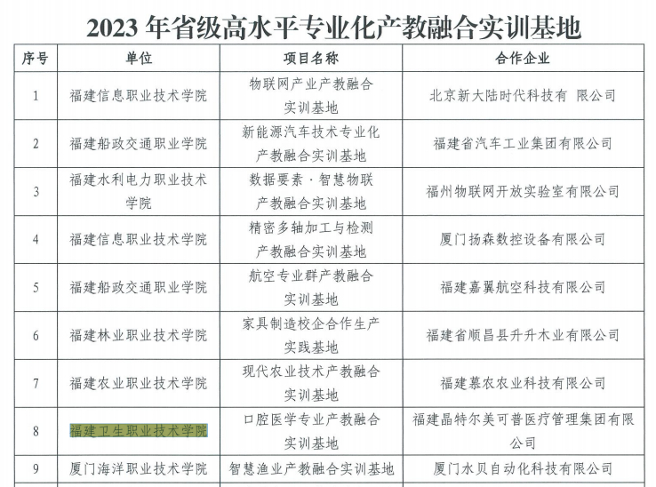 日前,福建省教育廳公布了2023年省級(jí)職業(yè)教育信息化和產(chǎn)教融合重點(diǎn)項(xiàng)目。我?!爸腔劢】诞a(chǎn)業(yè)學(xué)院”項(xiàng)目獲批省級(jí)第五批高職院校產(chǎn)業(yè)學(xué)院試點(diǎn)項(xiàng)目;“口腔醫(yī)學(xué)專業(yè)產(chǎn)教融合實(shí)訓(xùn)基地”項(xiàng)目獲批省級(jí)高水平專業(yè)化產(chǎn)教融合實(shí)訓(xùn)基地;《護(hù)理學(xué)基礎(chǔ)》《健康評(píng)估》《臨床藥物治療學(xué)》《健康管理實(shí)務(wù)》《藥學(xué)綜合知識(shí)與技能》《生理學(xué)》《康復(fù)評(píng)定技術(shù)》《電子技術(shù)應(yīng)用》8門課程獲評(píng)省級(jí)職業(yè)教育在線精品課程;“護(hù)理專業(yè)教學(xué)資源庫(kù)”“預(yù)防醫(yī)學(xué)專業(yè)教學(xué)資源庫(kù)”2個(gè)項(xiàng)目列為省級(jí)職業(yè)教育專業(yè)教學(xué)資源庫(kù);《醫(yī)學(xué)信息技術(shù)基礎(chǔ)》《成人護(hù)理-外科護(hù)理》《病理學(xué)與病理生理學(xué)》《經(jīng)絡(luò)與腧穴》4門省級(jí)職業(yè)教育精品在線開放課程通過(guò)驗(yàn)收。
