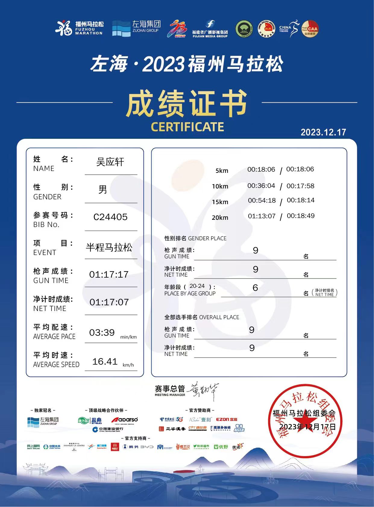 福州馬拉松目前已是中國(guó)田徑協(xié)會(huì)金牌賽事和世界田聯(lián)認(rèn)證的標(biāo)牌賽事,也是國(guó)內(nèi)規(guī)模最大的馬拉松賽事之一。本次比賽參賽人數(shù)共計(jì)5萬人,其中全程馬拉松1.2萬人,半程馬拉松2.3萬人,健康跑1.5萬人,報(bào)名涵蓋了全國(guó)34個(gè)省份的跑步選手,其中不乏國(guó)家隊(duì)、省隊(duì)等專業(yè)運(yùn)動(dòng)員以及10余個(gè)國(guó)家的外籍選手。我校學(xué)子吳應(yīng)軒在半程馬拉松項(xiàng)目中斬獲國(guó)內(nèi)第九名,達(dá)標(biāo)馬拉松國(guó)家二級(jí)運(yùn)動(dòng)員。