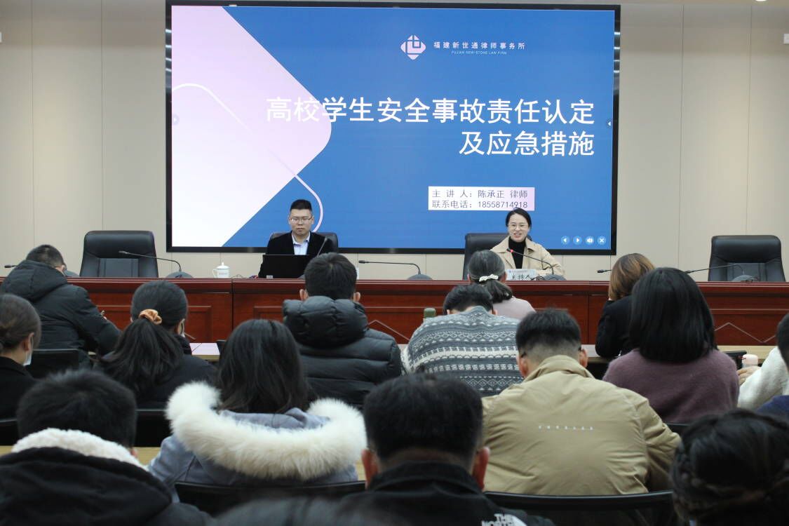 為進一步強化法治教育,提高學生安全管理法律意識,12月19日,學校法律顧問福建新世通律師事務所陳承正律師在行政樓六樓會議室作《高校學生安全事故責任認定及應急措施》專題講座。講座由黨政辦公室副主任陳盛蘭主持,黨政辦公室、學生工作部、安全工作處及各學院副書記、輔導員約70人參加。