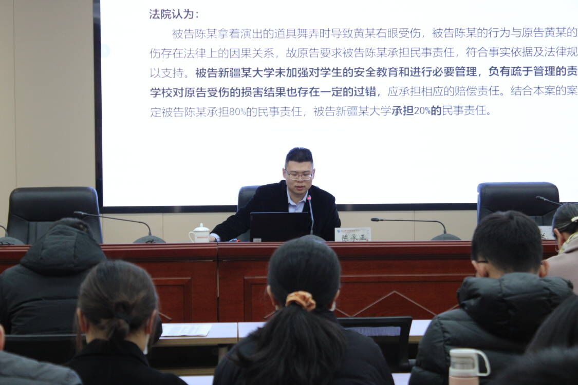 陳承正從學生傷害事故案例分享、高校校園安全事故責任認定的法律依據(jù)及如何應對學生安全事故三個方面展開,以案釋法,以法論事,為大家生動普及《中華人民共和國民法典》《學生傷害事故處理辦法》《普通高等學校學生安全教育及管理暫行規(guī)定》等法律法規(guī)。講座中,教職工積極進行法律咨詢互動,講座效果良好。