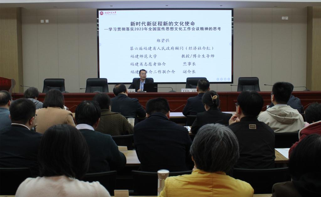 會(huì)上,福建師范大學(xué)鄭碧強(qiáng)教授作《新時(shí)代新征程新的文化使命》專(zhuān)題講座。鄭碧強(qiáng)教授分別從深刻領(lǐng)悟習(xí)近平文化思想的核心要義、習(xí)近平總書(shū)記在福建工作期間有關(guān)宣傳思想文化工作的重要理念與重大實(shí)踐、新形勢(shì)下做好宣傳思想文化工作的福建優(yōu)勢(shì)與基礎(chǔ)、新形勢(shì)下做好我省宣傳思想文化工作面臨的挑戰(zhàn)、新形勢(shì)下扎實(shí)做好我省宣傳思想文化工作的對(duì)策思路五個(gè)方面深入淺出、系統(tǒng)全面闡釋了新時(shí)代新征程新的文化使命。對(duì)于我校深入學(xué)習(xí)貫徹習(xí)近平新時(shí)代中國(guó)特色社會(huì)主義思想和習(xí)近平文化思想,推動(dòng)學(xué)校宣傳思想文化工作落細(xì)落實(shí)具有重大指導(dǎo)意義。