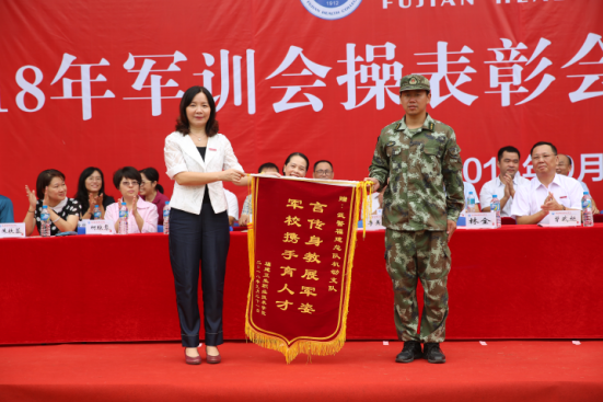 大會表彰了“軍訓退役學生教官”8人,“優(yōu)秀軍訓學員”577人,“軍訓優(yōu)秀小隊”10個,“軍訓內(nèi)務優(yōu)秀宿舍”35間。為表達對承訓部隊的感謝,紀委書記李美華代表學院向武警福建總隊機動支隊贈送了“言傳身教展軍姿 軍校攜手育人才”的錦旗。