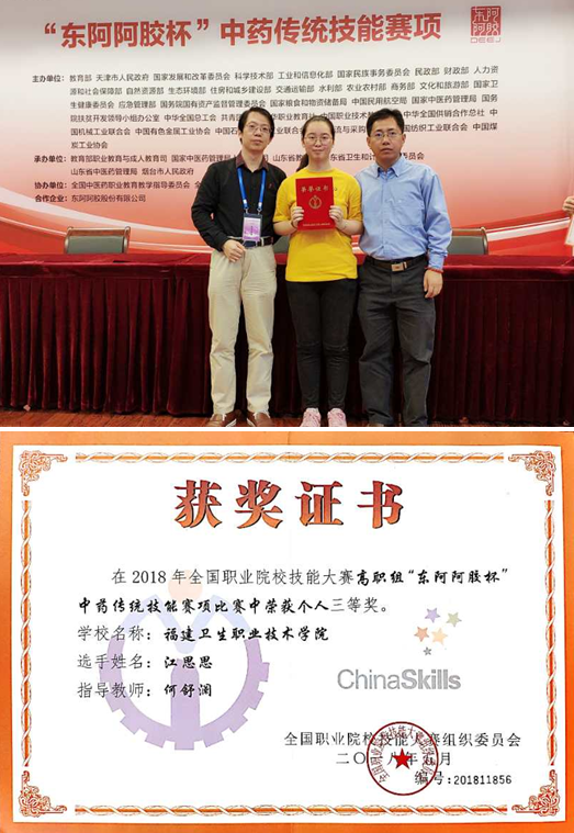 5月31日至6月1日,2018年全國職業(yè)院校技能大賽“東阿阿膠杯”中藥傳統(tǒng)技能賽項在山東中醫(yī)藥高等??茖W(xué)校舉行,共有來自全國27個省69所院校的115名選手參加本次大賽。我院藥學(xué)系15中藥301班江思思同學(xué)榮獲中藥傳統(tǒng)技能賽項個人三等獎。