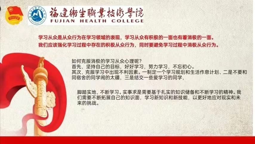 本學(xué)期以來,健康學(xué)院各班級(jí)宣傳委員組織同學(xué)們通過介紹毛澤東同志的生平事跡,集中學(xué)習(xí)偉人的精神品格和歷史貢獻(xiàn),激勵(lì)同學(xué)們不斷前行,做有理想、能吃苦、肯奮斗的新時(shí)代好青年。