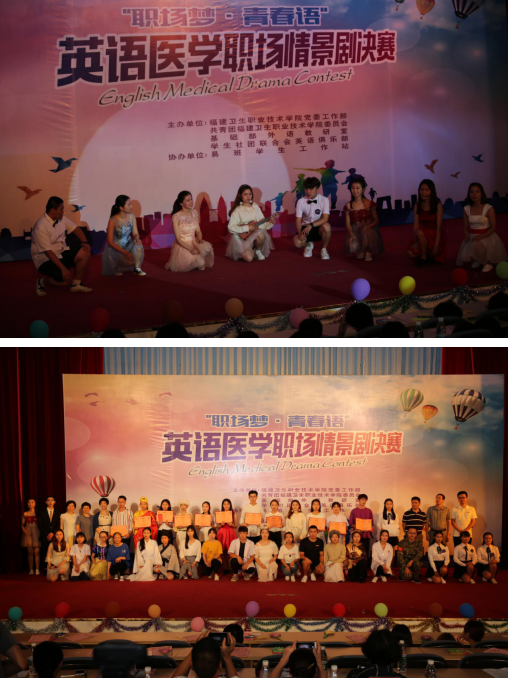 為踐行十九大,弘揚(yáng)醫(yī)德醫(yī)風(fēng),豐富校園文化生活,探索醫(yī)學(xué)英語教學(xué)新模式,6月12日,由學(xué)院黨委工作部、團(tuán)委、基礎(chǔ)部外語教研室聯(lián)合主辦的“職場(chǎng)夢(mèng)·青春語”英語醫(yī)學(xué)職場(chǎng)情景劇決賽在學(xué)術(shù)廳隆重舉行,我院黨委曾武祈書記、黨委林建團(tuán)副書記、紀(jì)委李美華書記、鄭翠紅副院長(zhǎng)以及相關(guān)職能處室、系部領(lǐng)導(dǎo)蒞臨比賽現(xiàn)場(chǎng)。