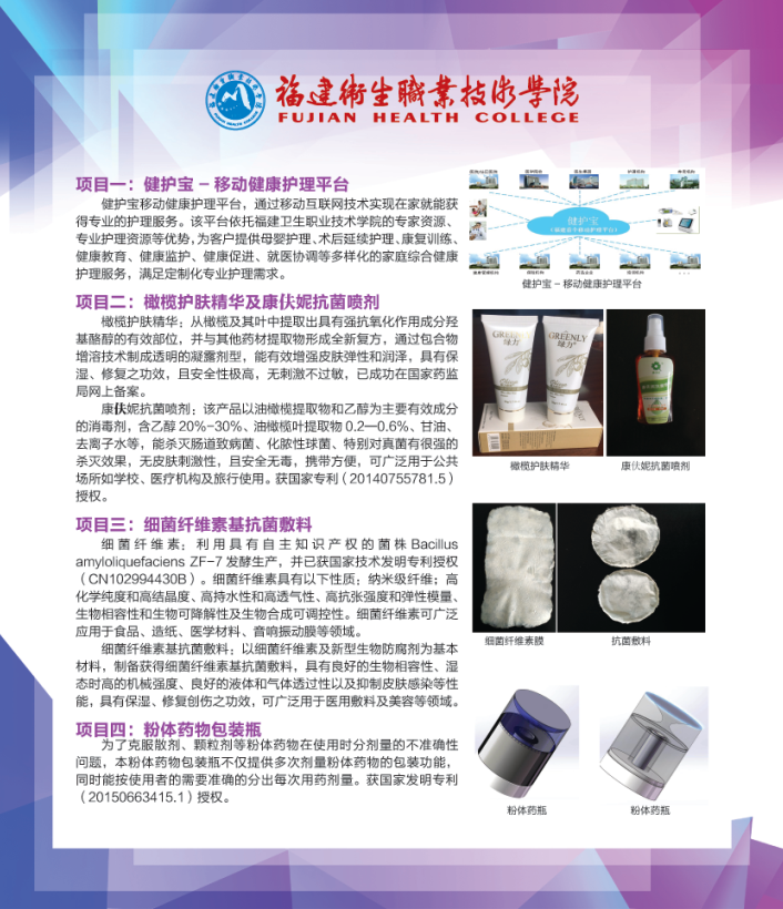 6月18日至21日,第十六屆中國?海峽項(xiàng)目成果交易會(簡稱6.18)在福州海峽國際會展中心舉行。此次高校成果展館設(shè)有福建省“雙一流”建設(shè)高校獨(dú)立展區(qū)、省外高校綜合展區(qū)、高校協(xié)同創(chuàng)新中心成果展區(qū)、優(yōu)秀青年博士展區(qū)、“互聯(lián)網(wǎng)+”展區(qū)、高等教育綜合展區(qū)、職業(yè)教育綜合展區(qū)等七大主題展區(qū),共有北京大學(xué)、清華大學(xué)等27所省外高校,廈門大學(xué)、福州大學(xué)等42所省內(nèi)高校763項(xiàng)優(yōu)秀科技成果參展。在職業(yè)教育綜合展區(qū),我院組織了健護(hù)寶-移動健康護(hù)理平臺、細(xì)菌纖維素基抗菌敷料、橄欖護(hù)膚精華及康伕妮抗菌噴劑、粉體藥物包裝瓶等4個項(xiàng)目成果參展,吸引了不少兄弟院校及觀展人員駐足觀看。學(xué)院曾武祈書記、鄭翠紅副院長、科研處朱扶蓉處長及項(xiàng)目負(fù)責(zé)人李其鏗、黃仁杰、朱宏陽、唐小巒等同志參加了此次展會活動。
